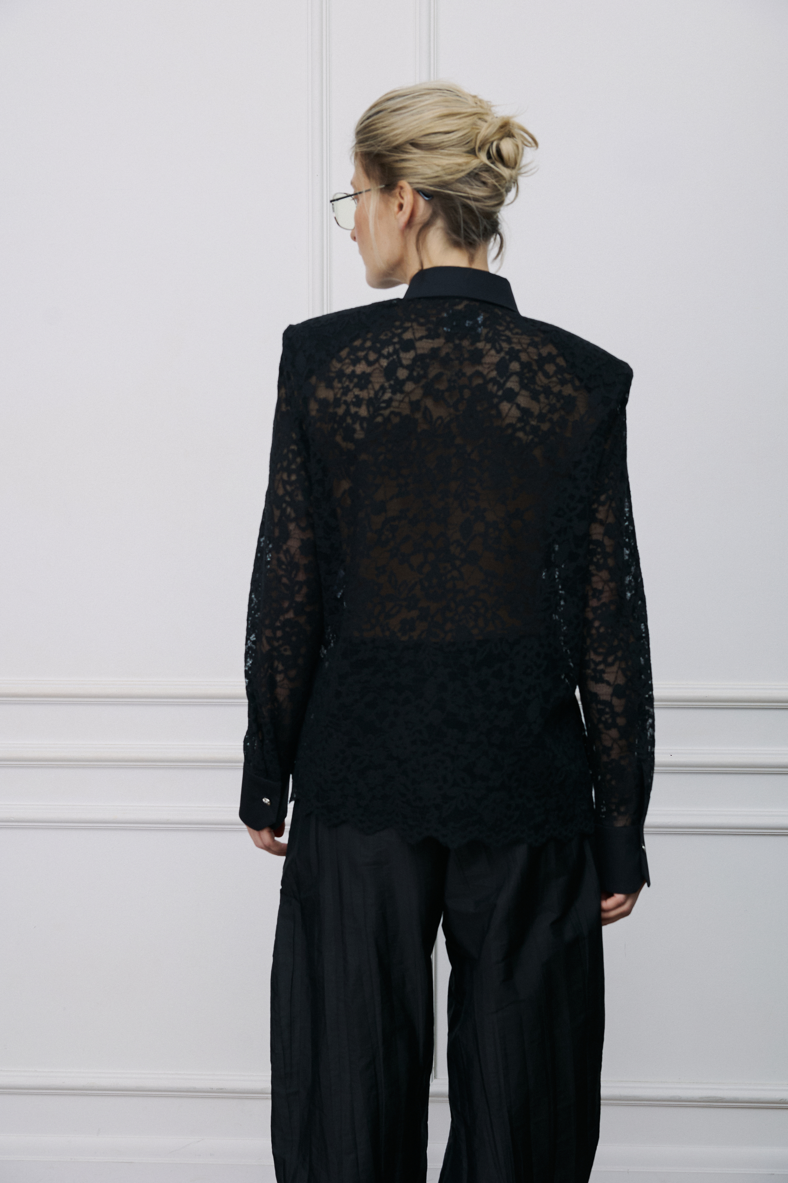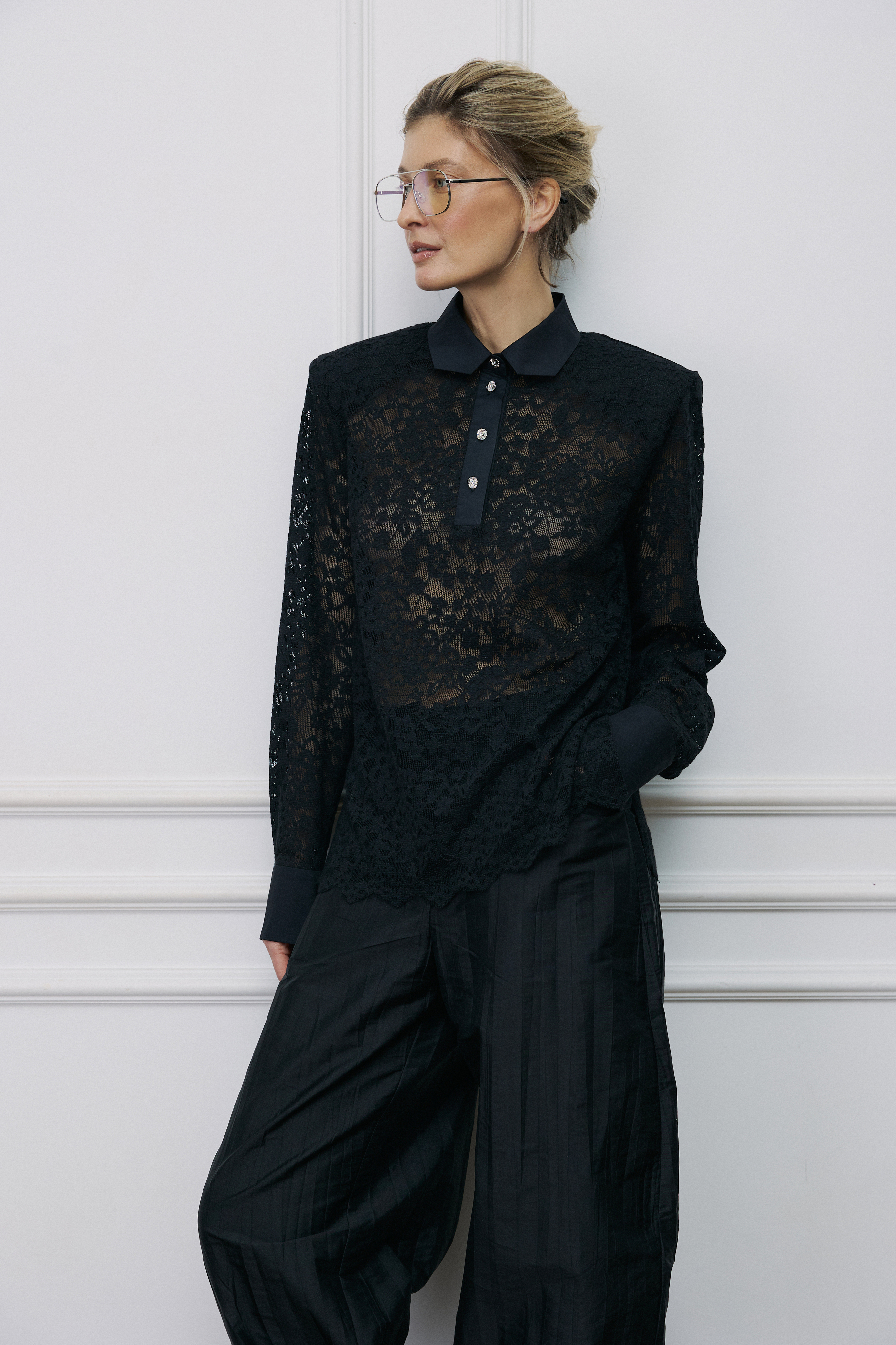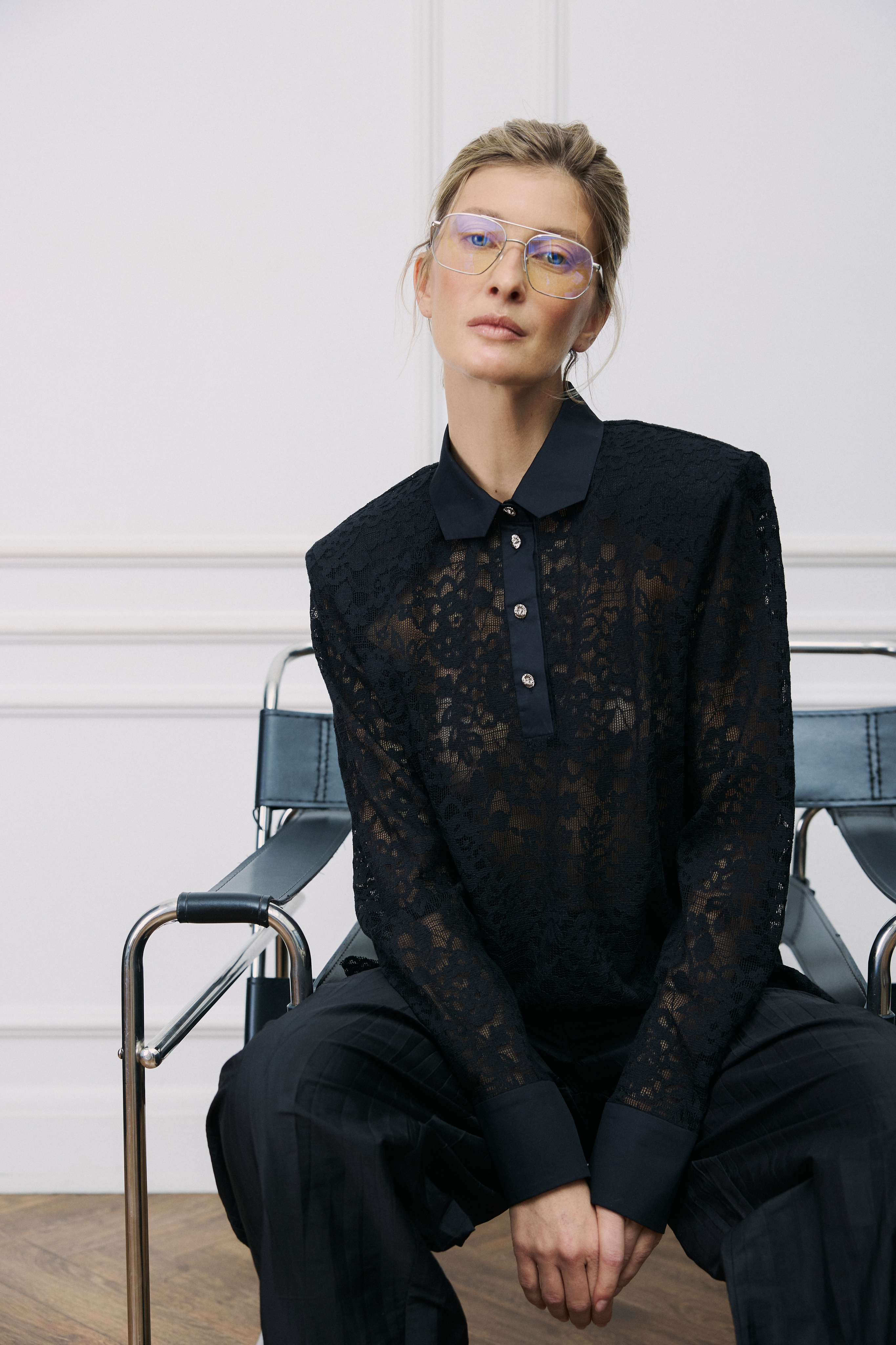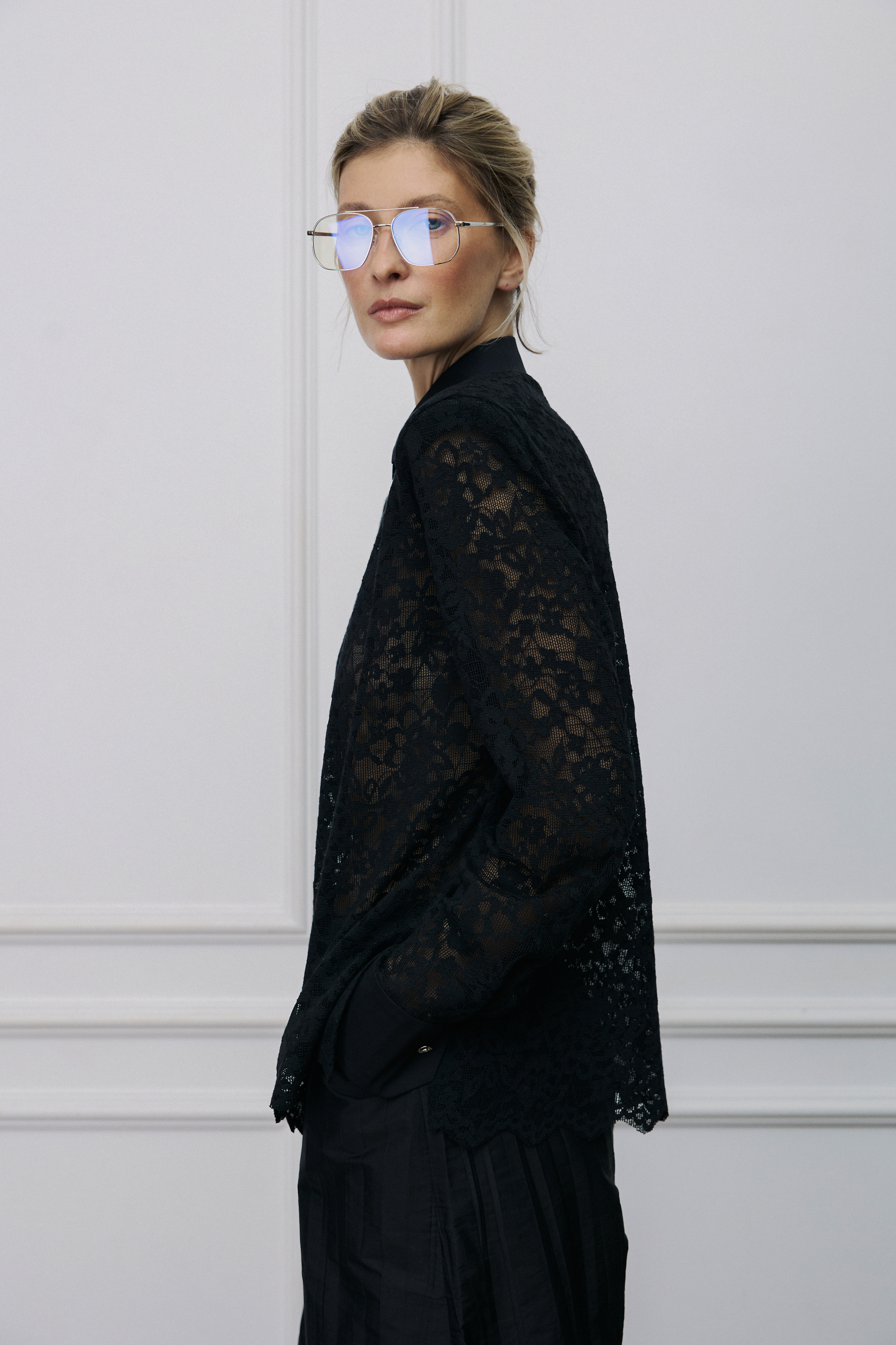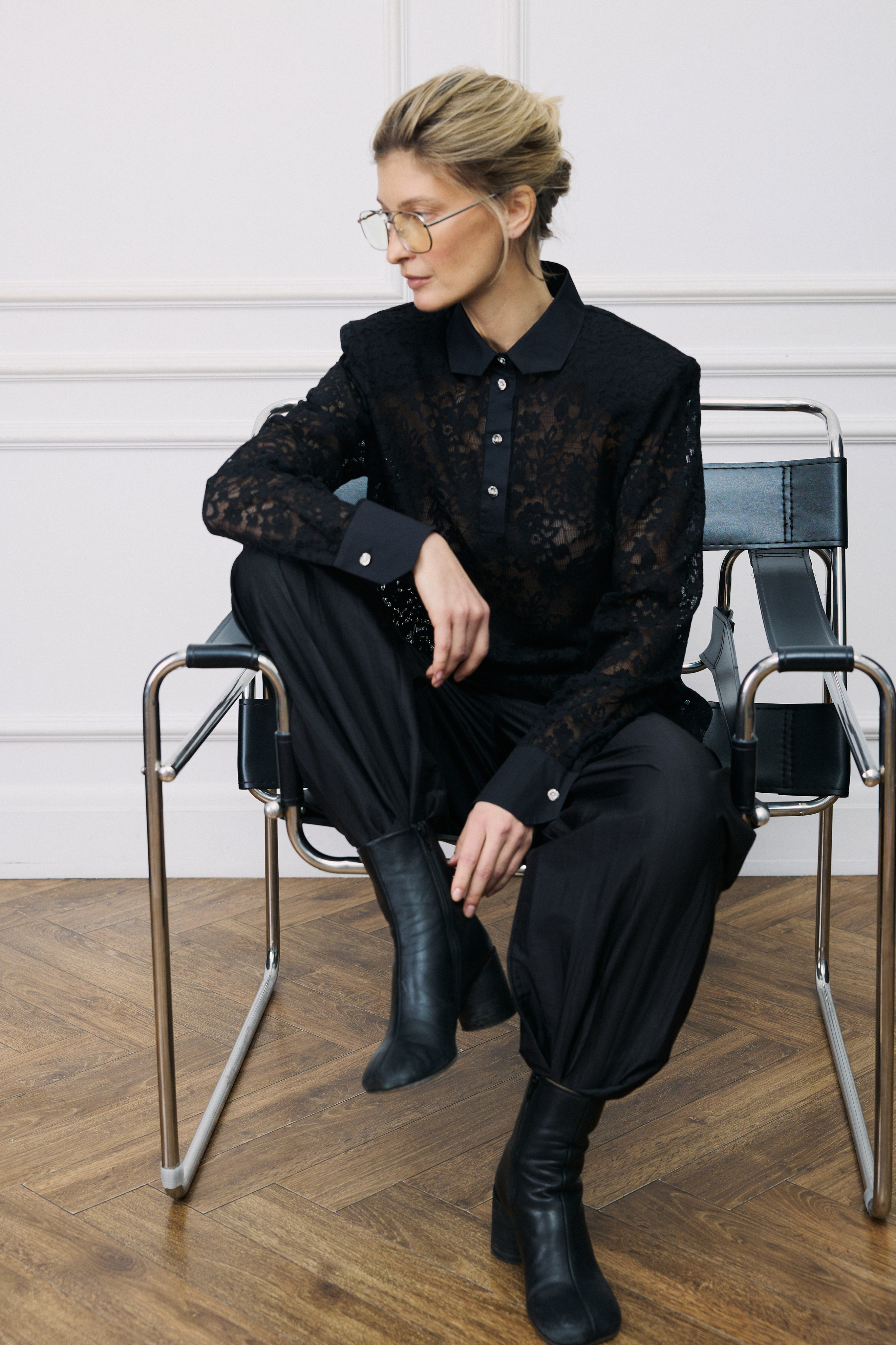Нежное кружево и гладкий итальянский хлопок (воротник, манжеты, планка) в одной модели. По бокам удобные шлицы. Съемные подплечники нужно убрать при стирке, чтобы они не деформировались, или носить блузу без них.
