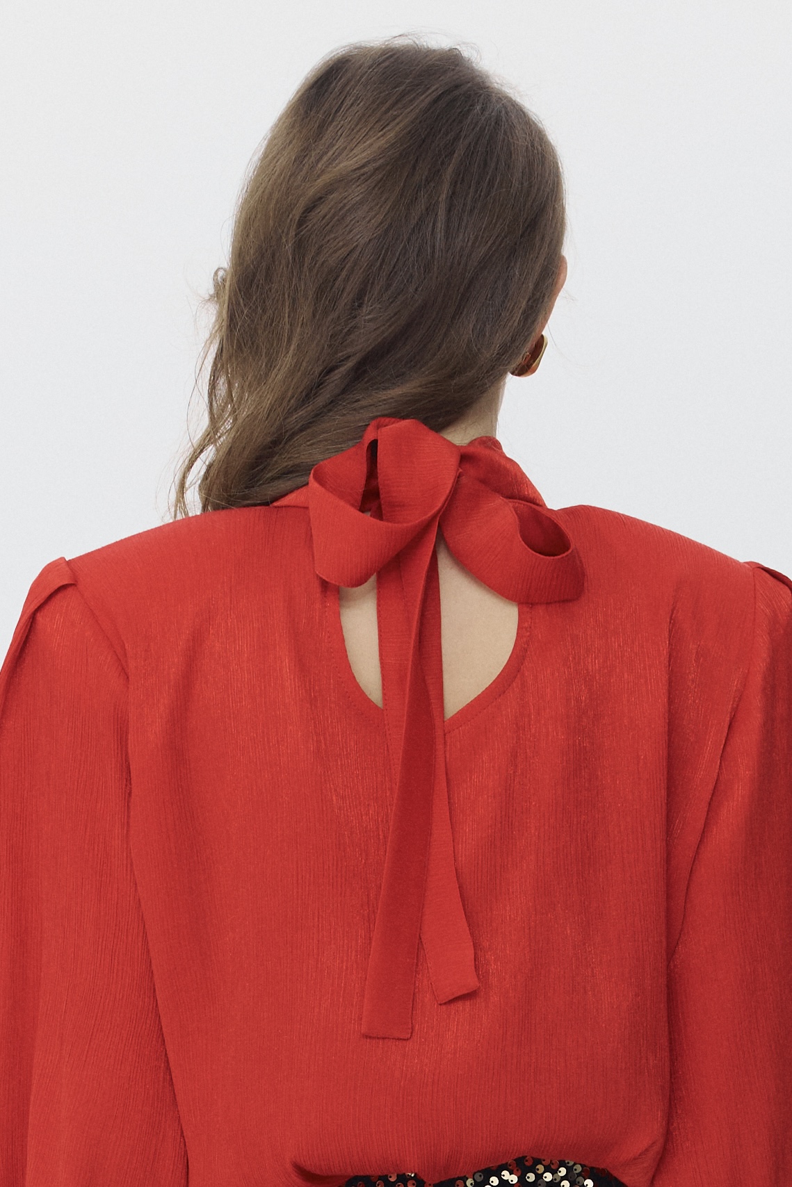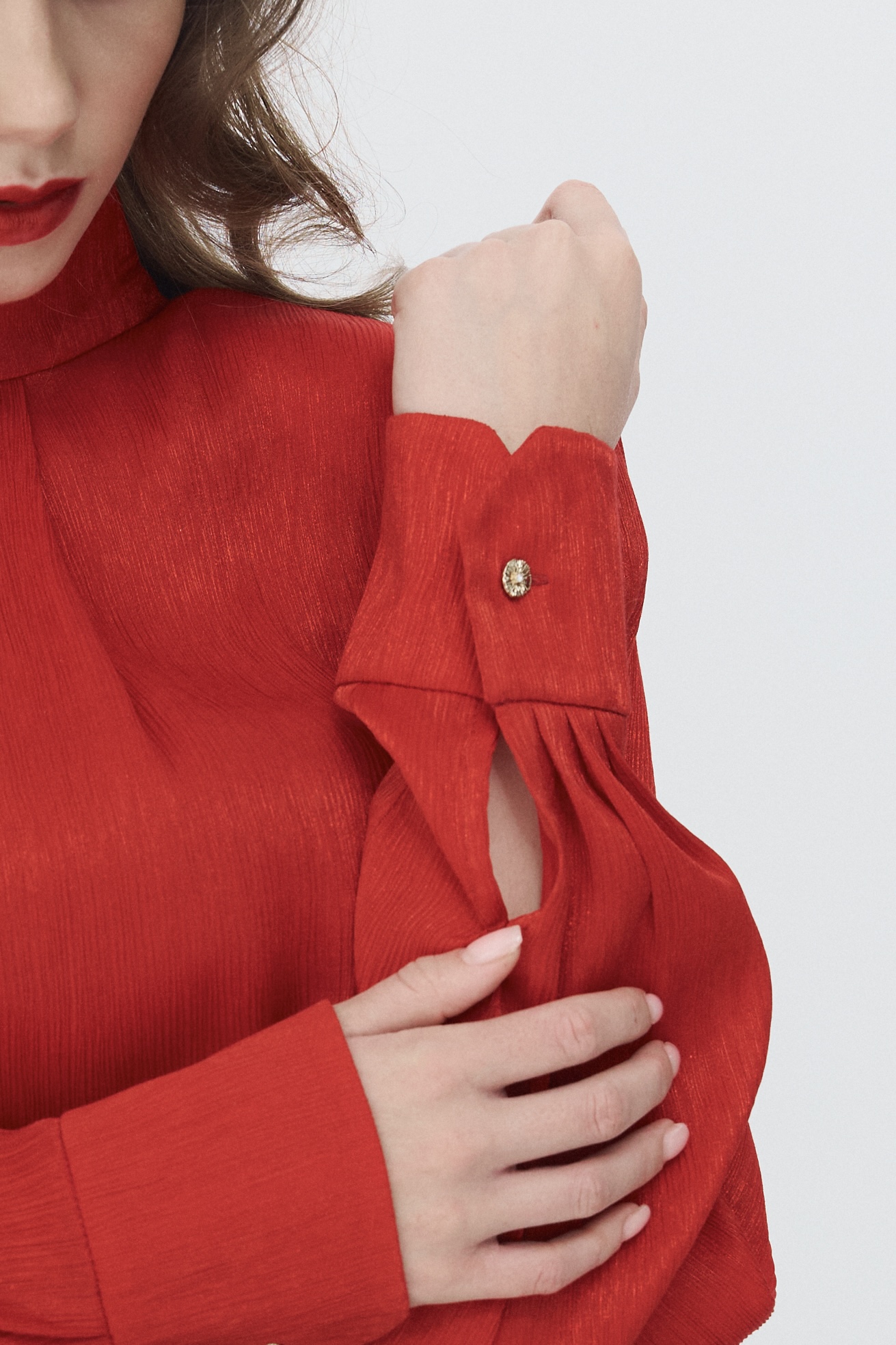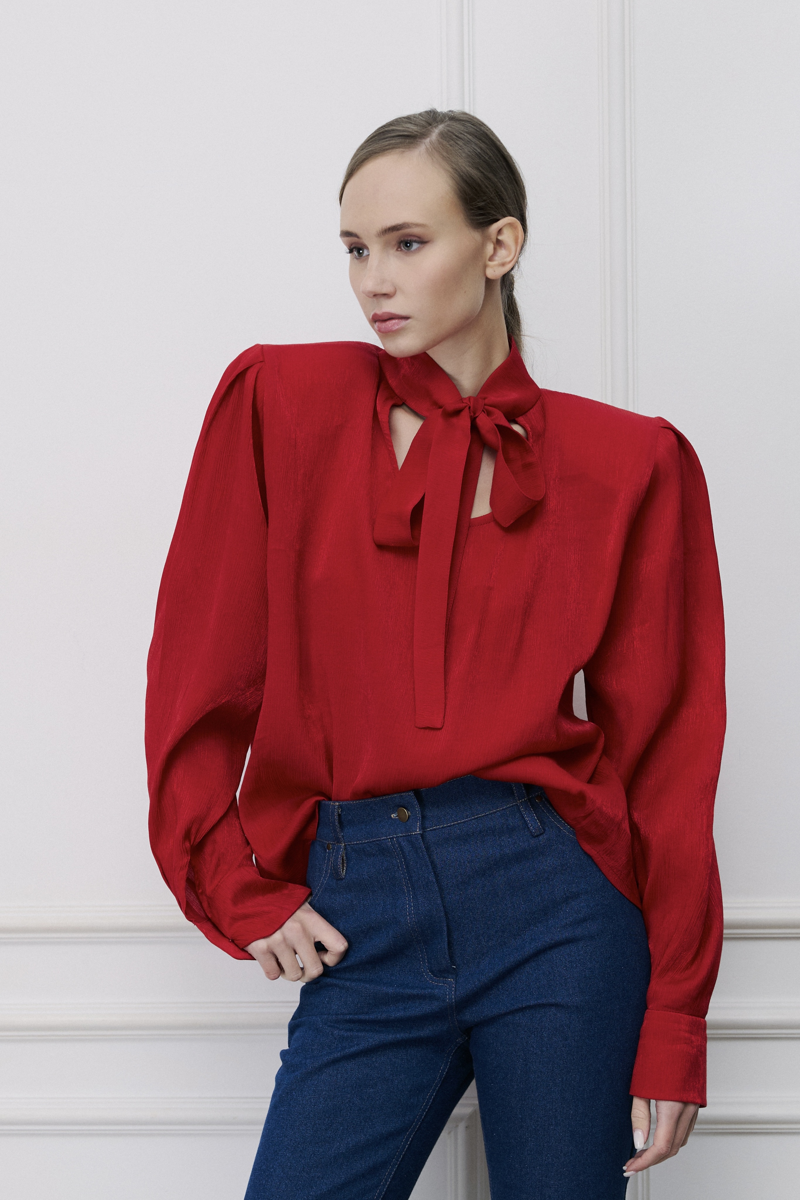 Эффектная блуза из фактурной крэш-ткани, мерцающей благодаря серебристой нити люрекса. Модель с регулируемой завязкой на горловине и манжетами на пуговицах. Деталь дизайна: подплечники на кнопках, что позволяет создавать два разных образа — от дерзкого и архитектурного до более мягкого и романтичного.