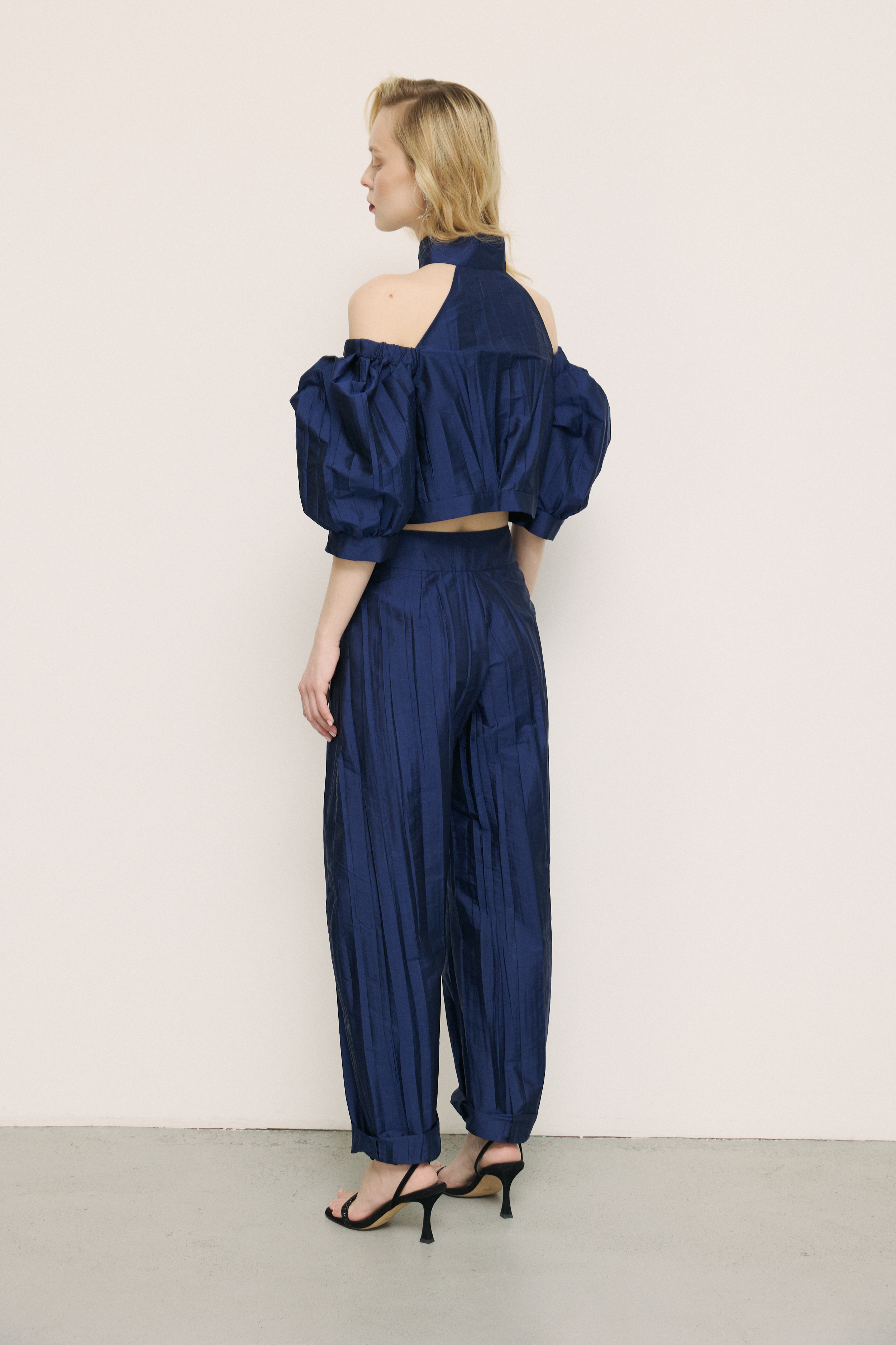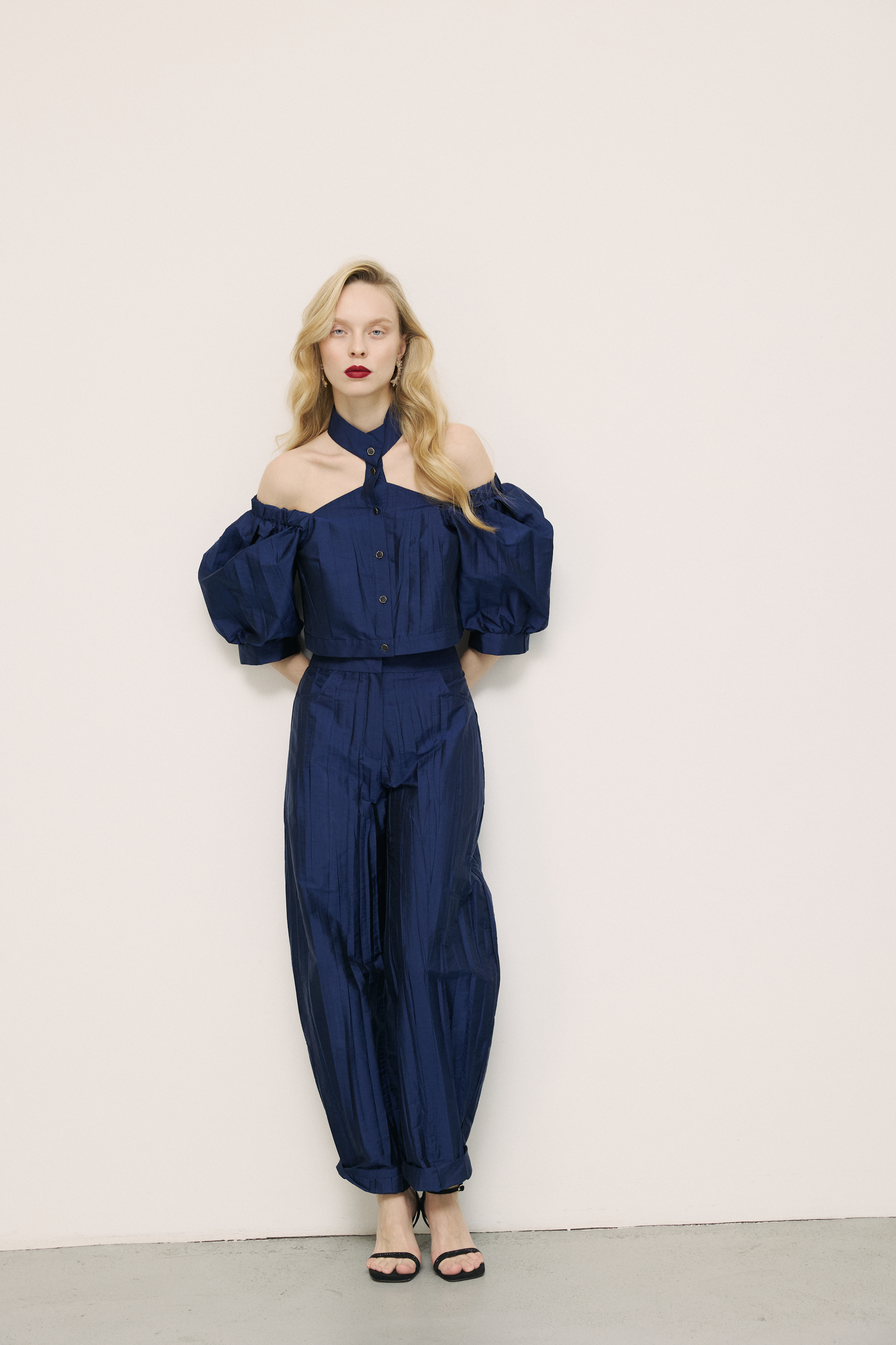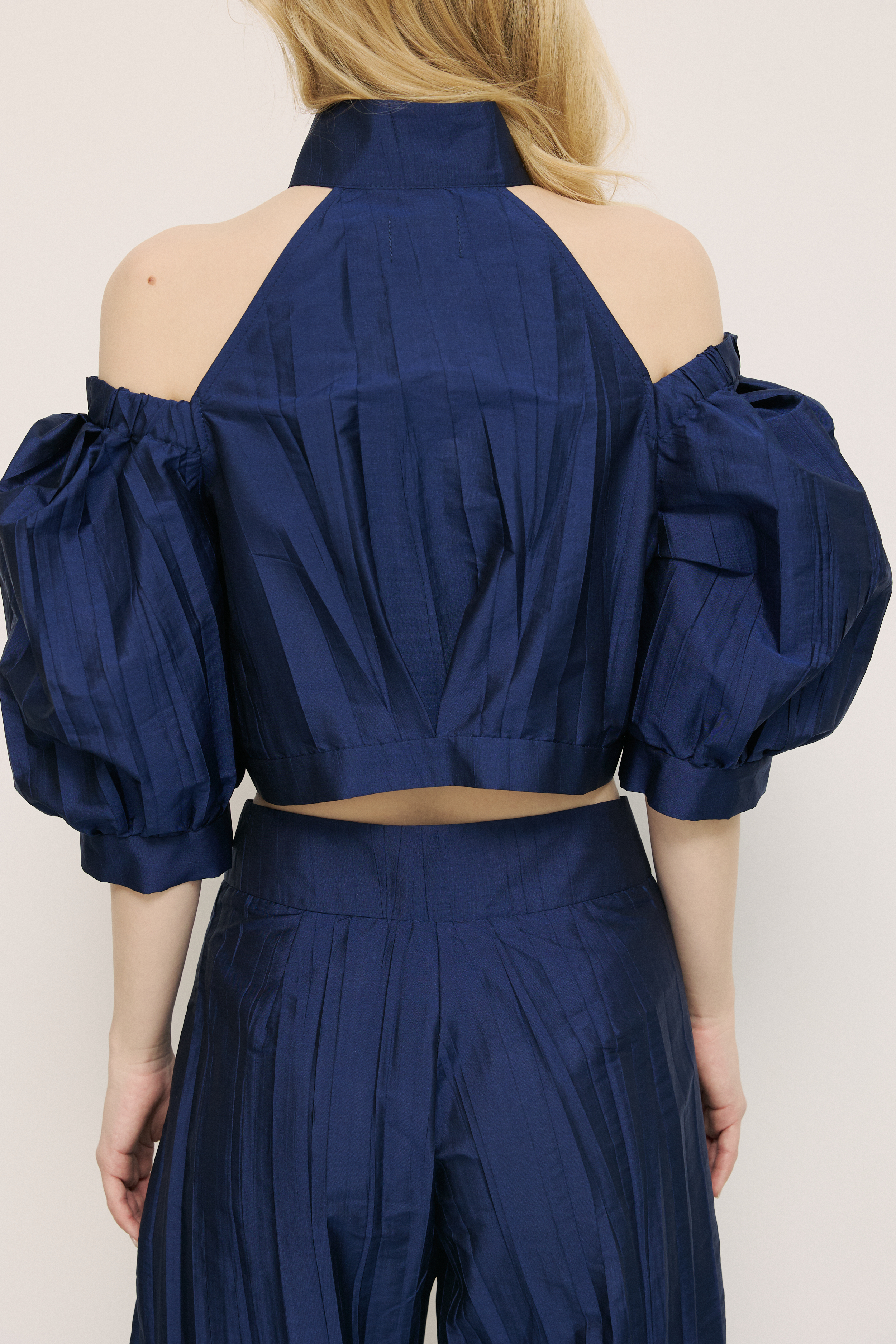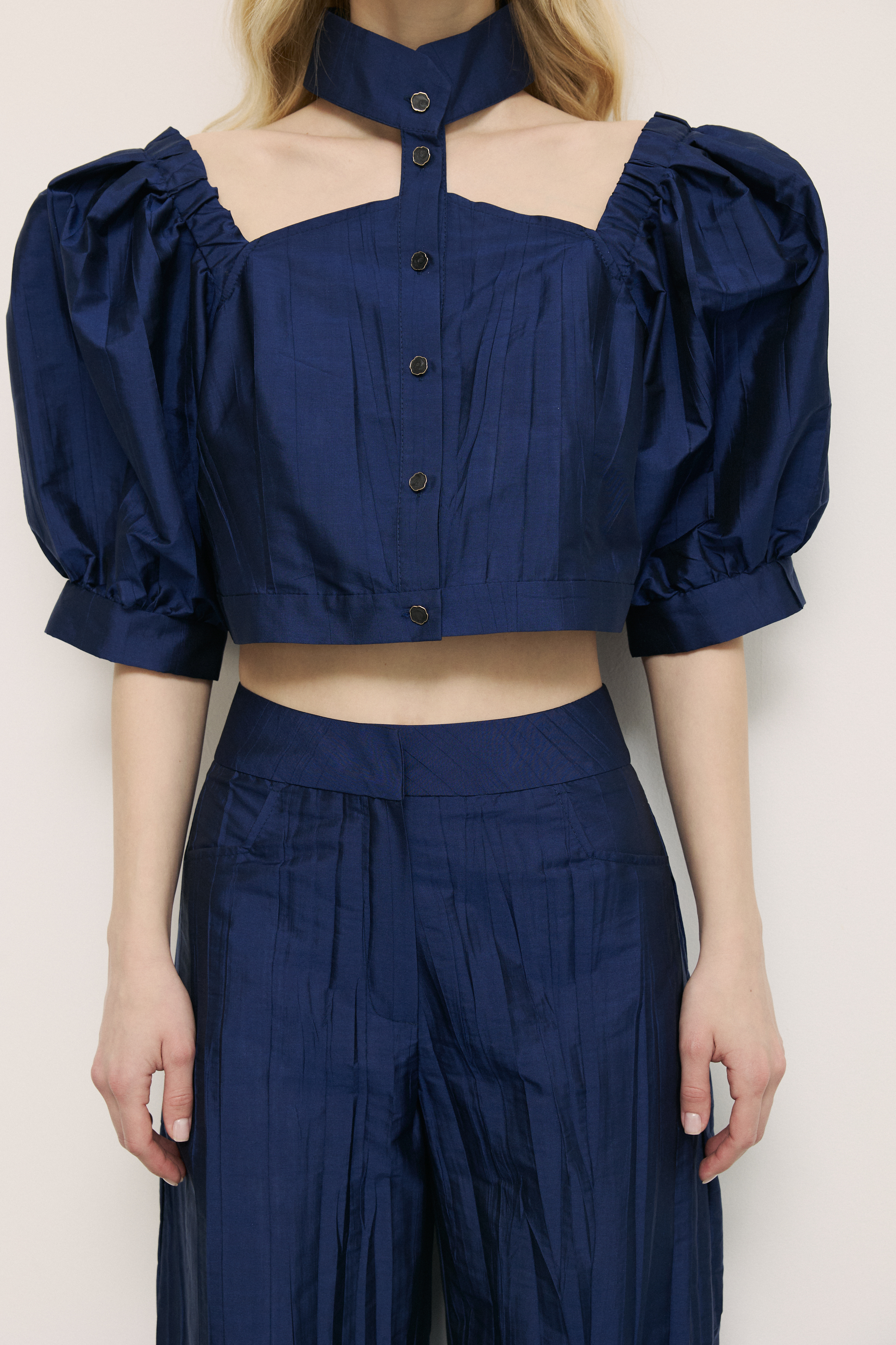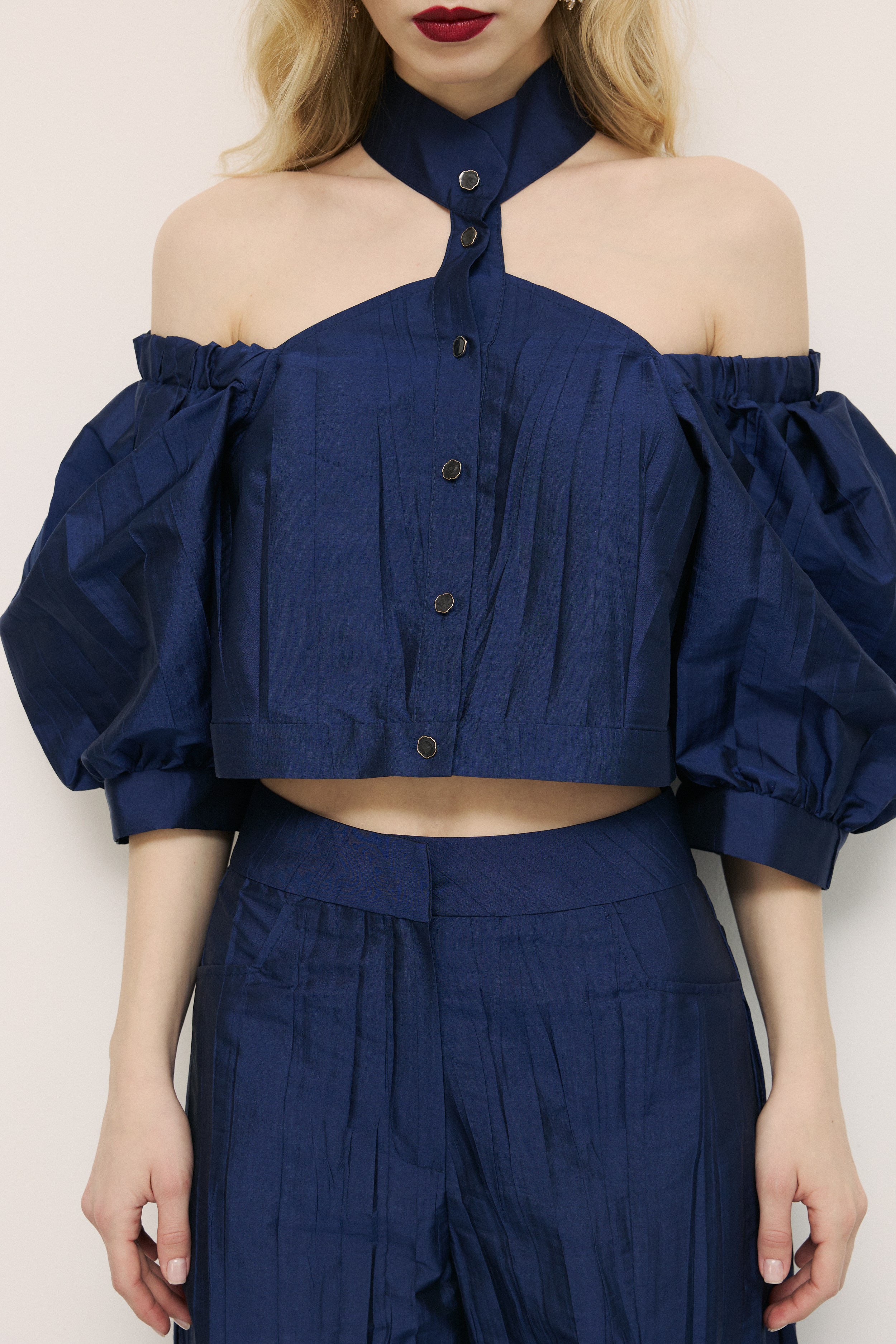 Блуза свободного кроя из крэш ткань. Полочка имеет рубашечный вид, по низу изделия резинка. На полочке и спинке по 2 выточки. Открытые плечи. Воротник со скошенными углами, стойка соединяется по переду с планкой и центральной частью спинки. Рукав фонариком до локтя.