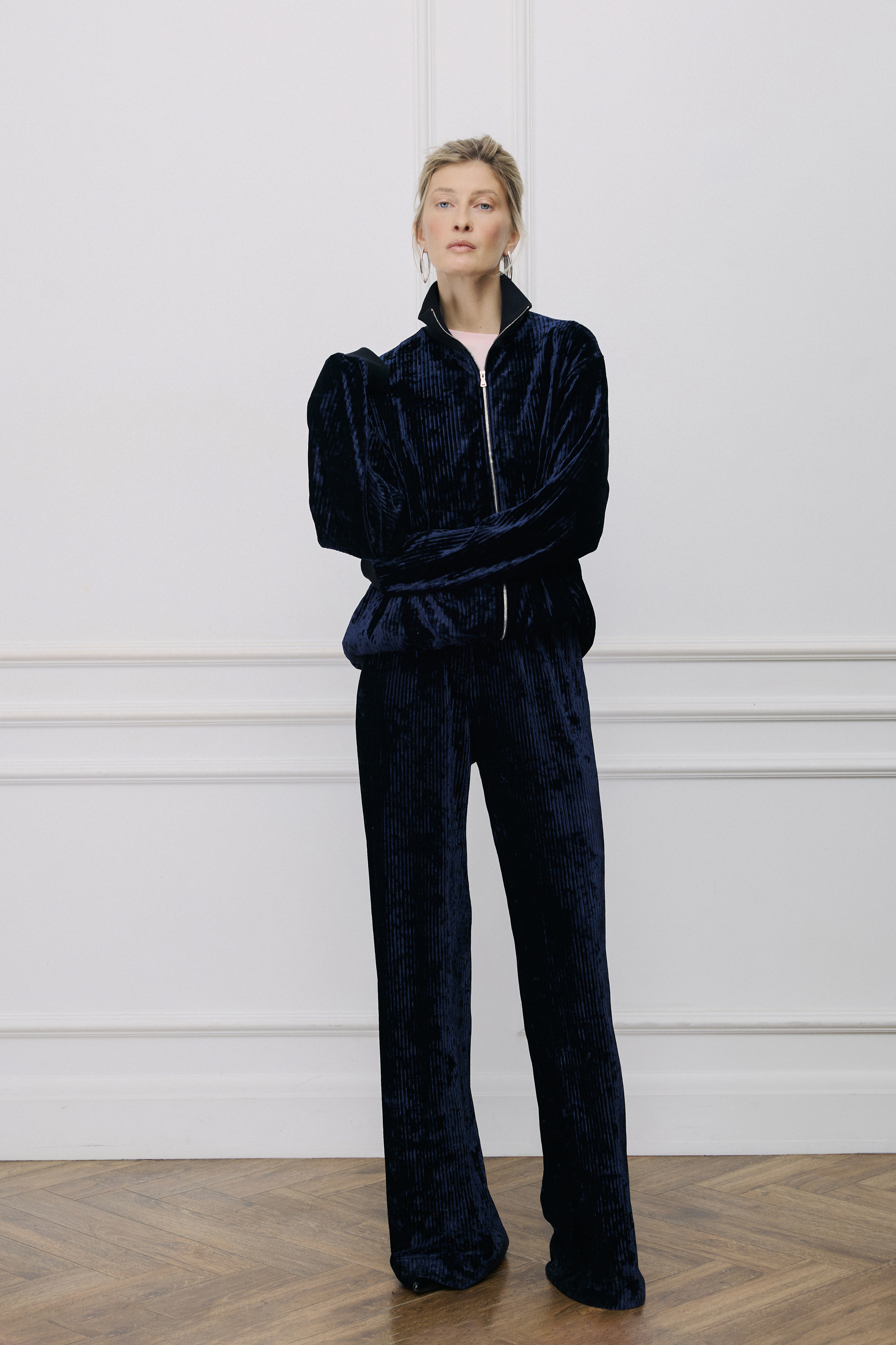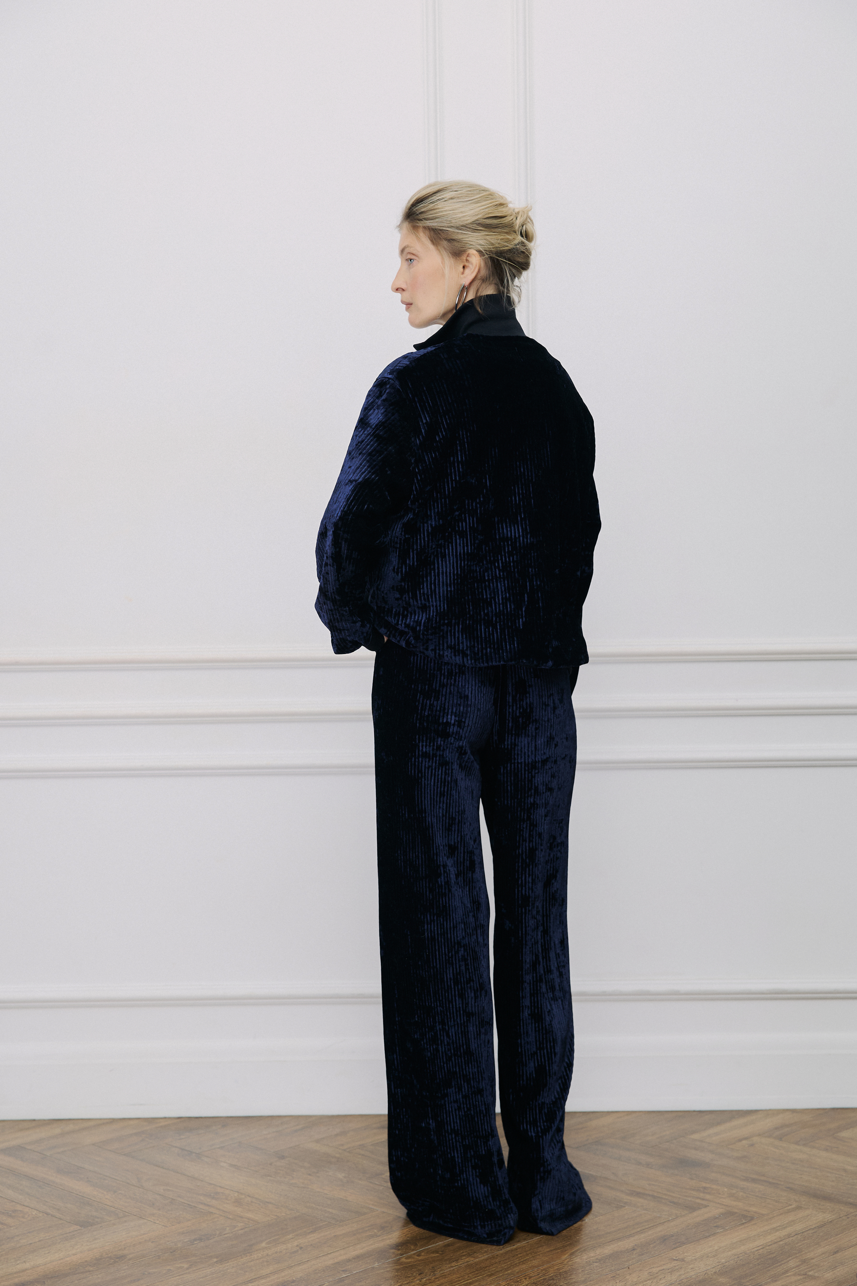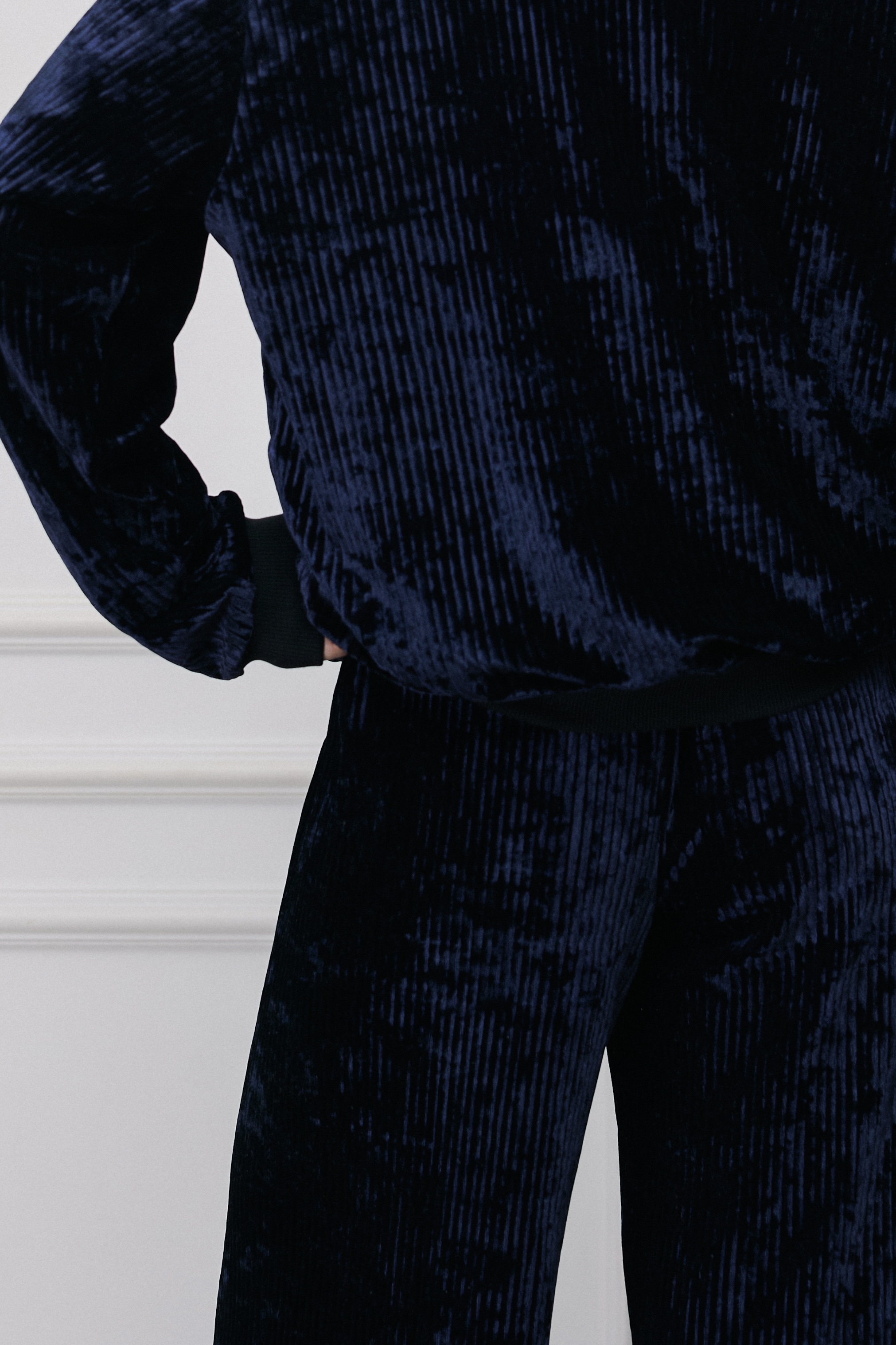 Отсутствие бокового шва создает идеальную вертикаль, которая вытягивает силуэт и делает ноги стройнее визуально. Ткань плотная, но струящаяся. Мы влюбились в нее 3 года назад и решили проверить чувства временем. Устроили опрос, покупательницы подтвердили: вещи из этого материала до сих пор выглядят как новые.