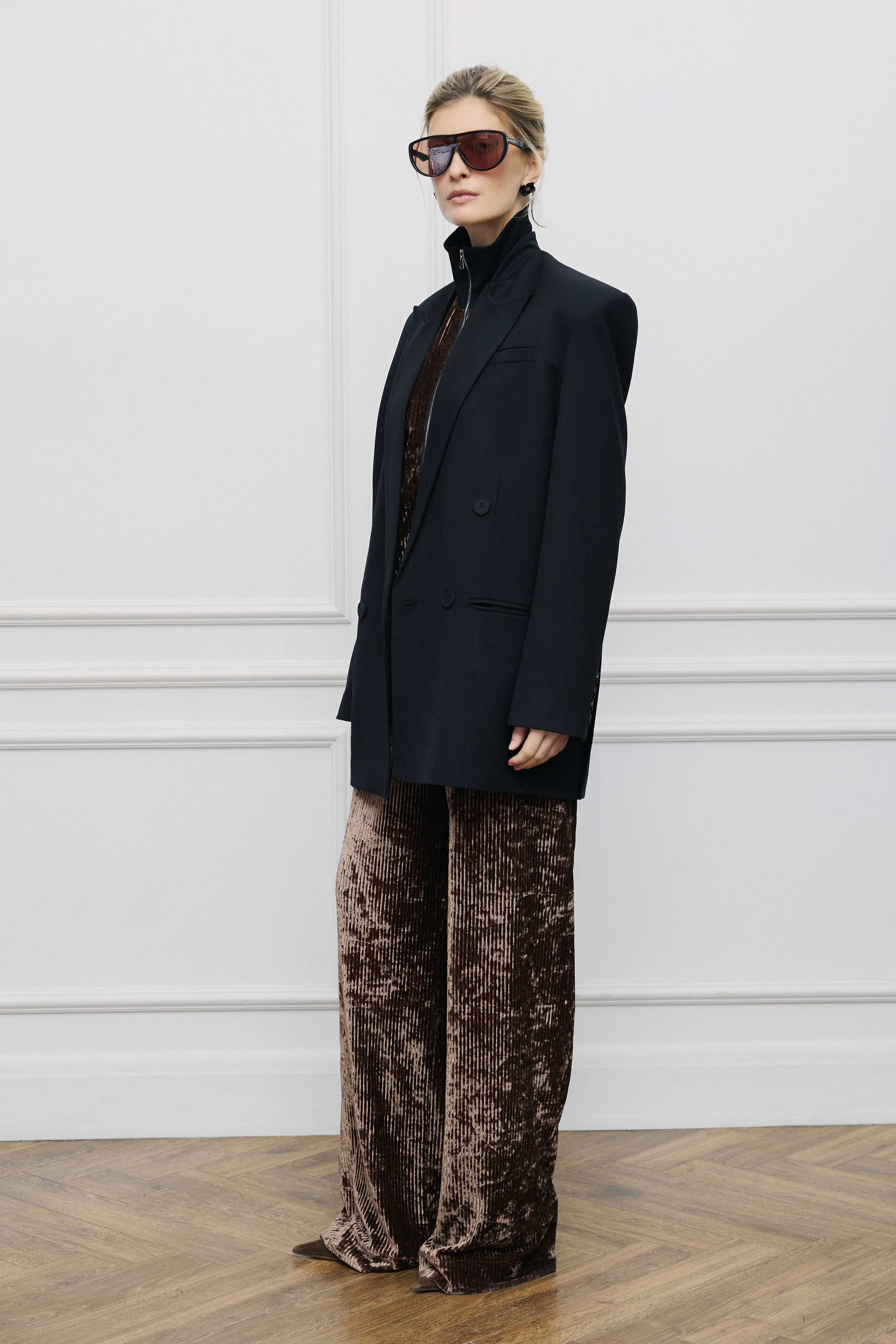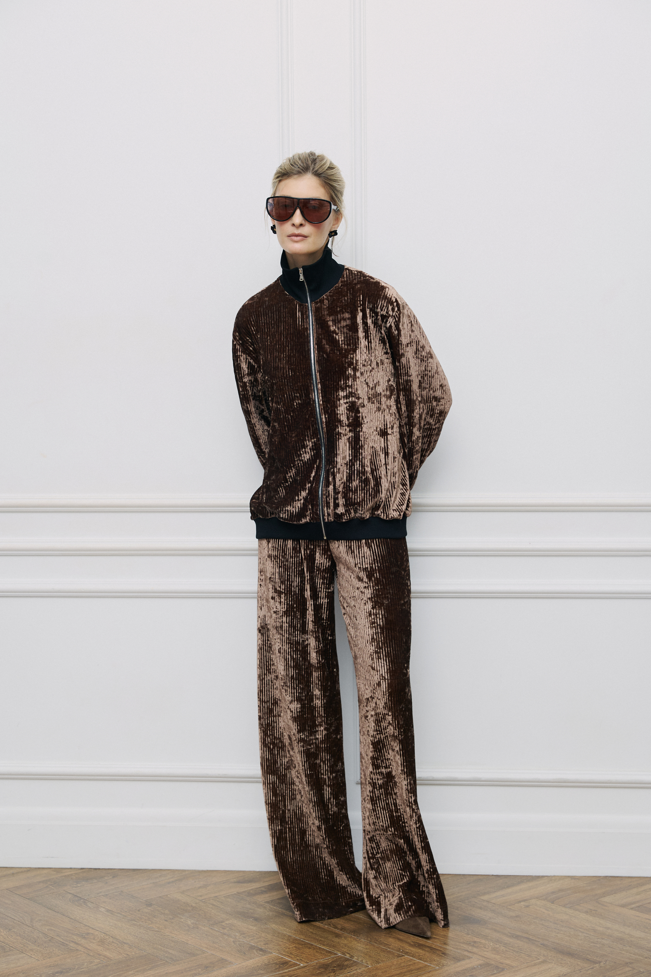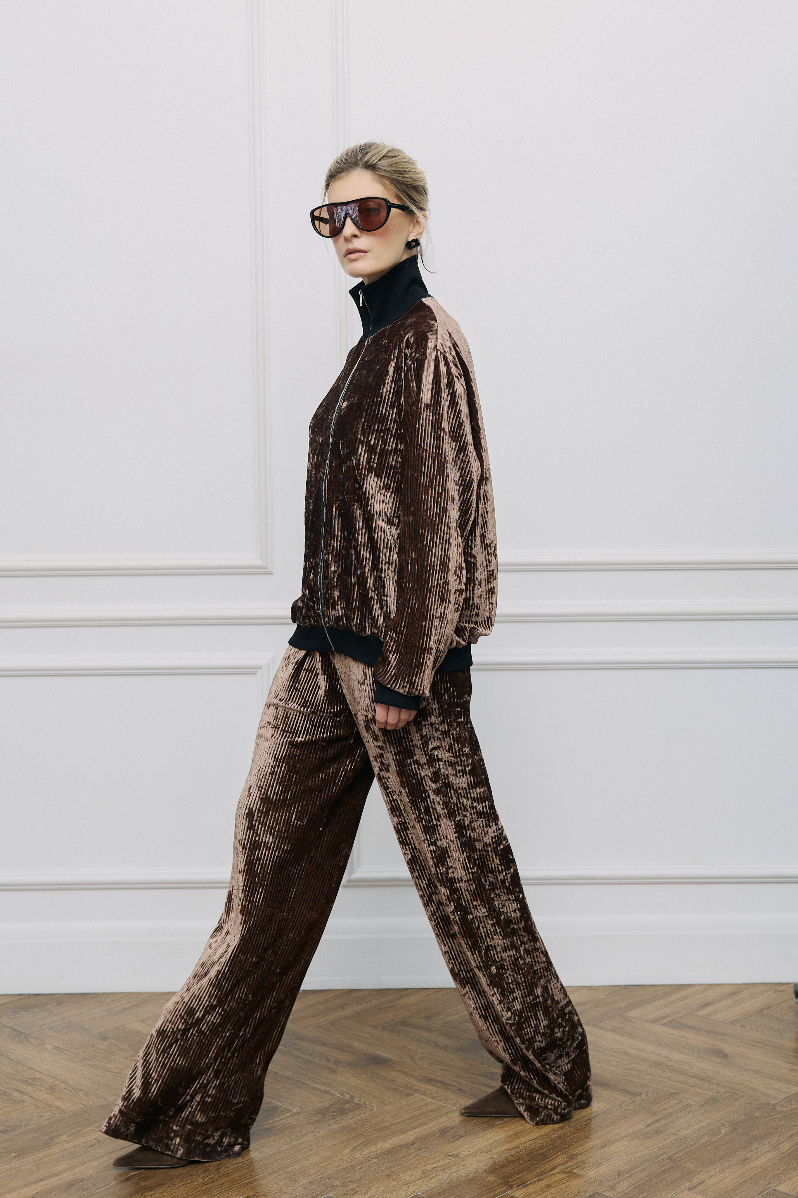 Отсутствие бокового шва создает идеальную вертикаль, которая вытягивает силуэт и делает ноги стройнее визуально. Ткань плотная, но струящаяся. Мы влюбились в нее 3 года назад и решили проверить чувства временем. Устроили опрос, покупательницы подтвердили: вещи из этого материала до сих пор выглядят как новые.
