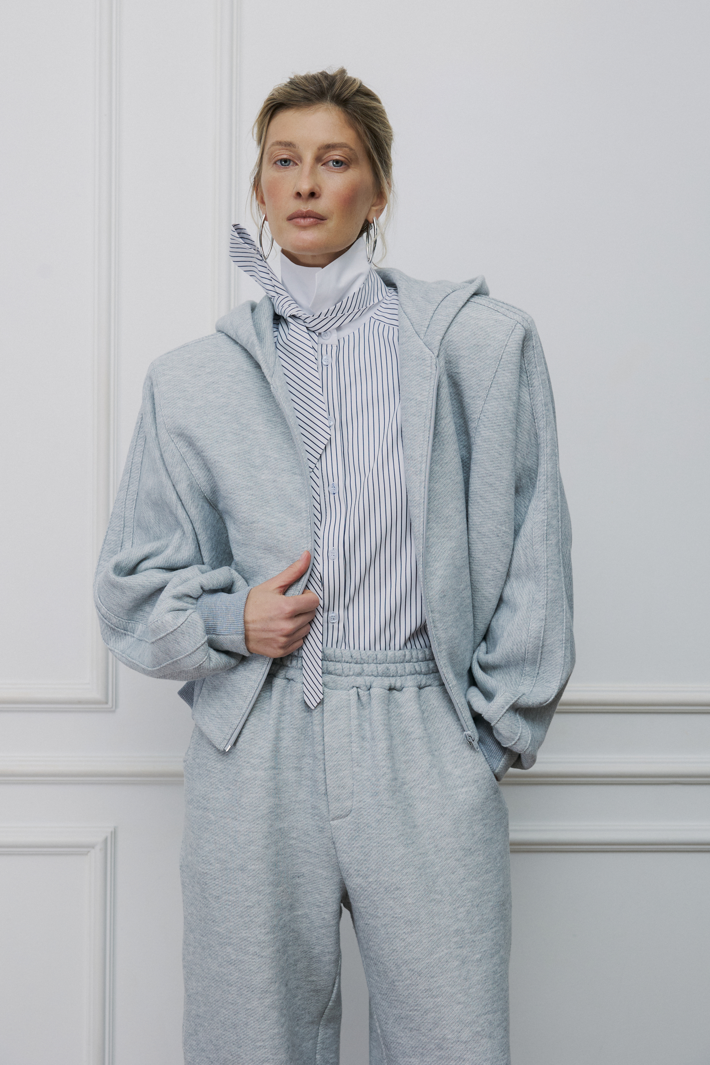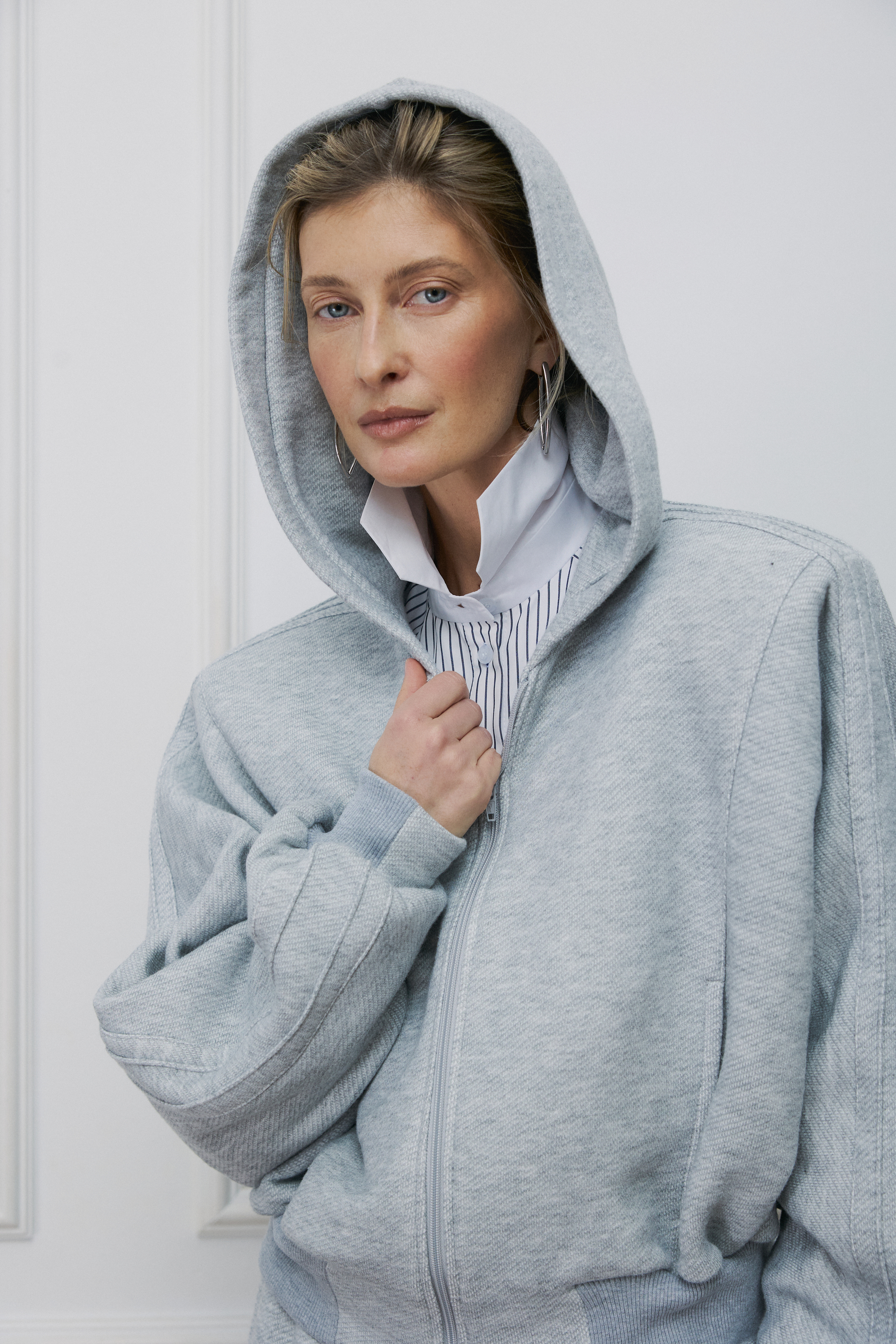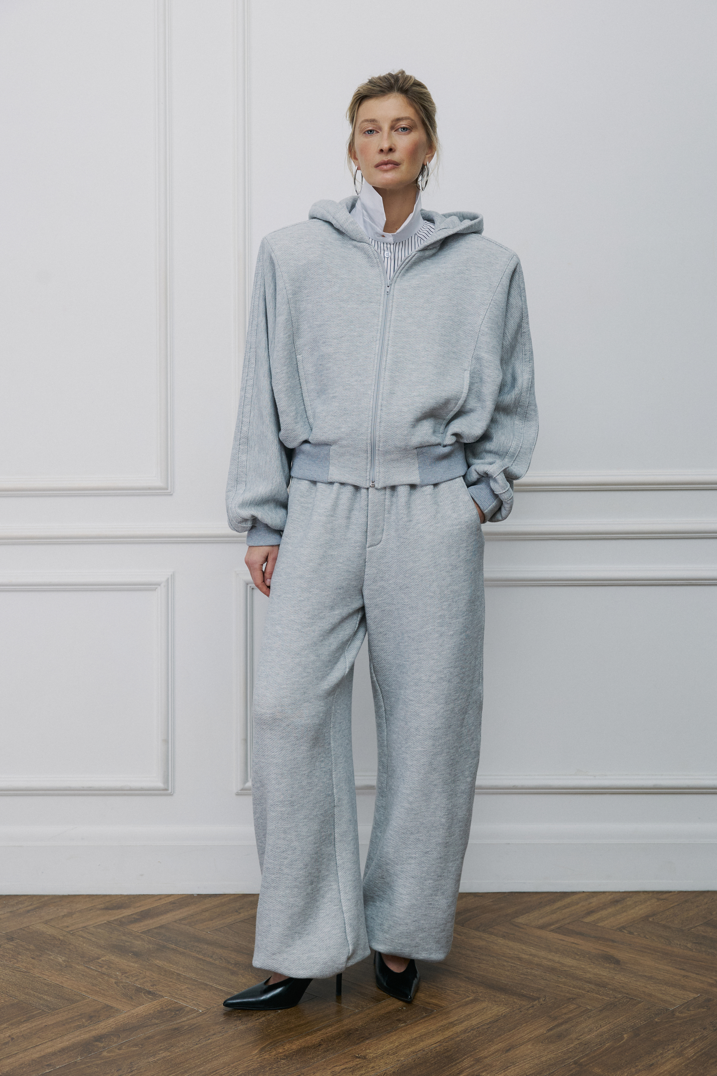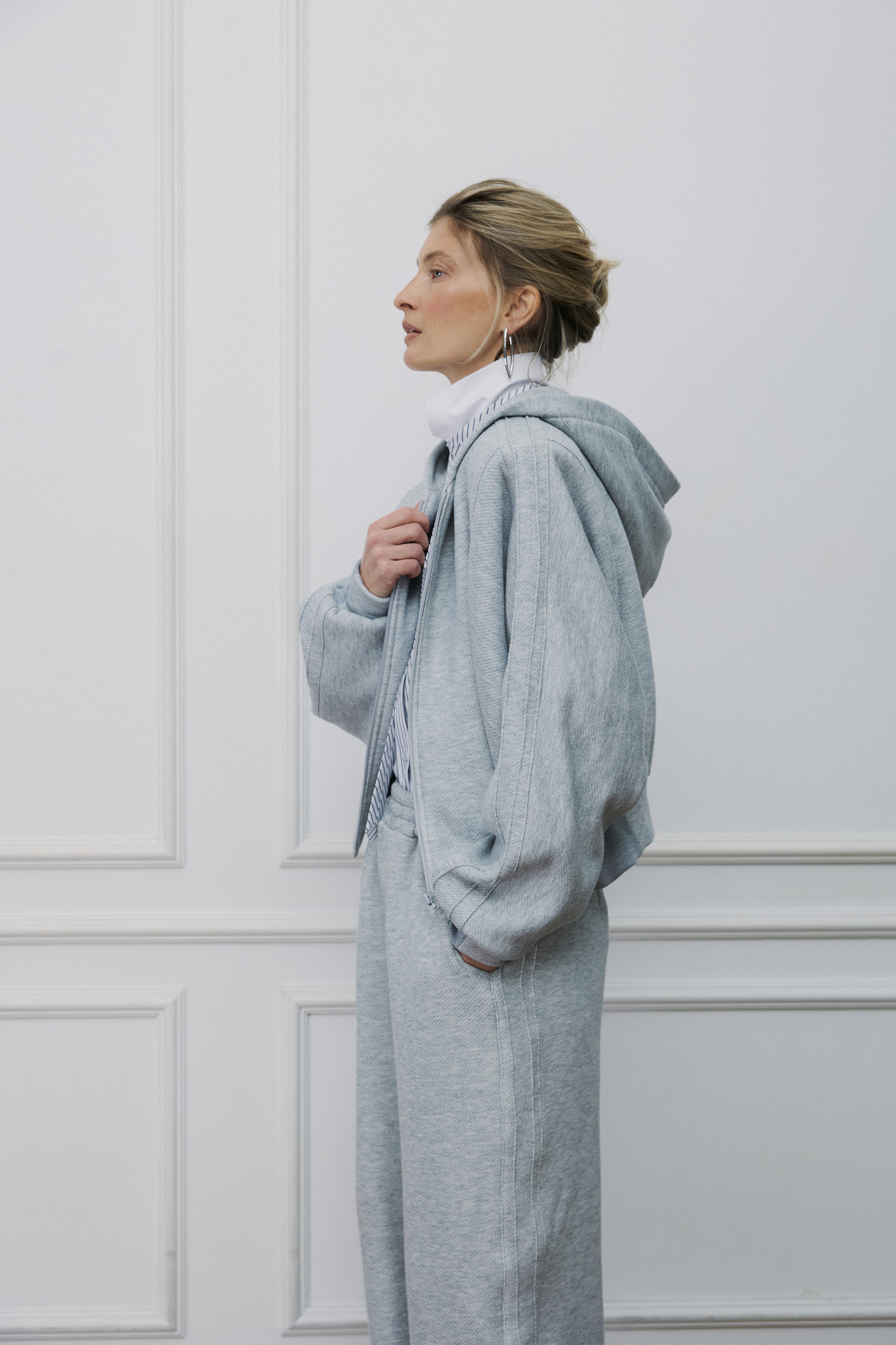 В этом худи мы соединили графичность архитектуры и расслабленный дух Парижа. Укороченный объемный силуэт, вместительный капюшон, цельнокройный рукав и мягкий серый меланж из премиального футера трехнитки. Модель на молнии со съемными подплечниками, носите с ними для четкости линий или уберите, когда хочется мягкости.