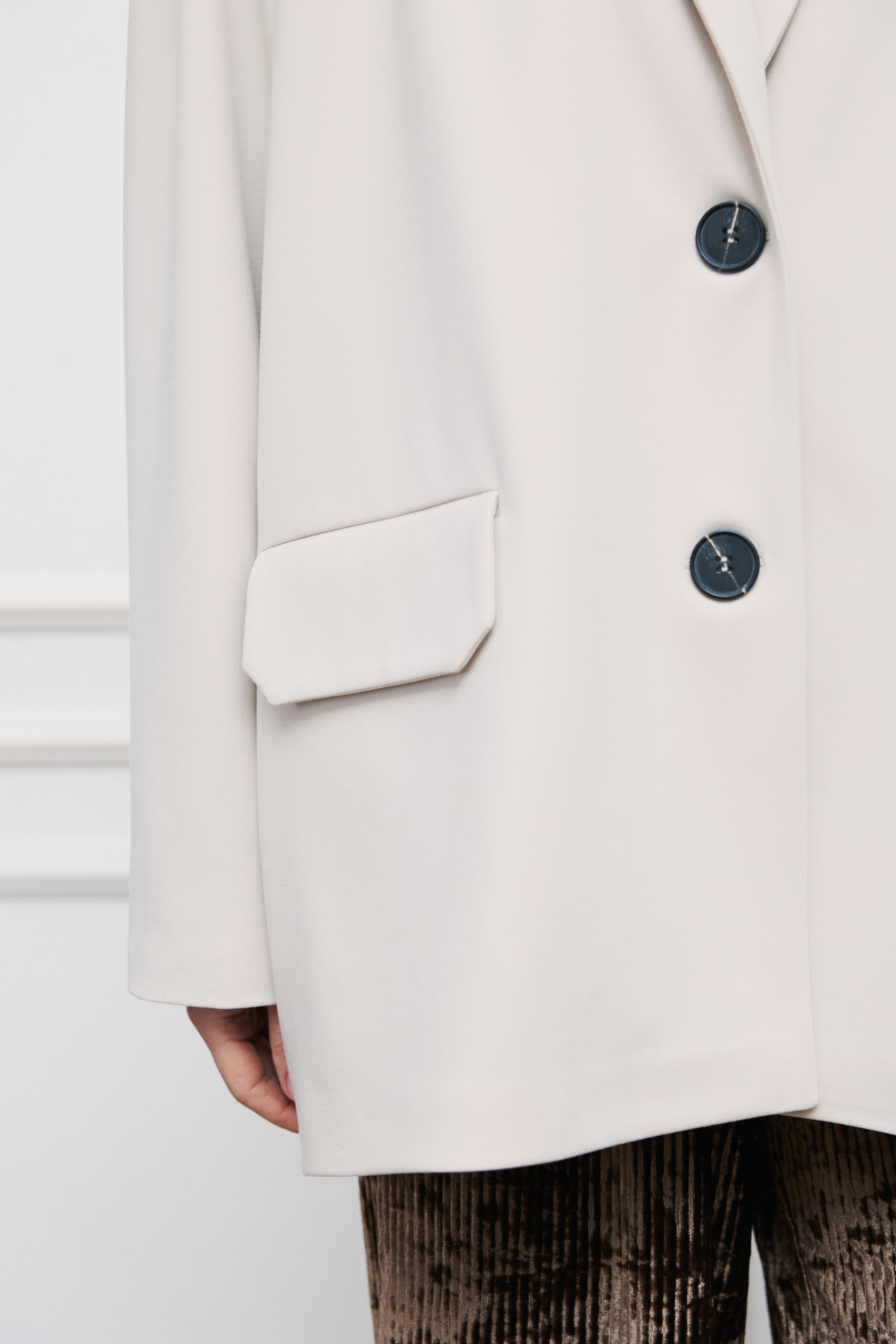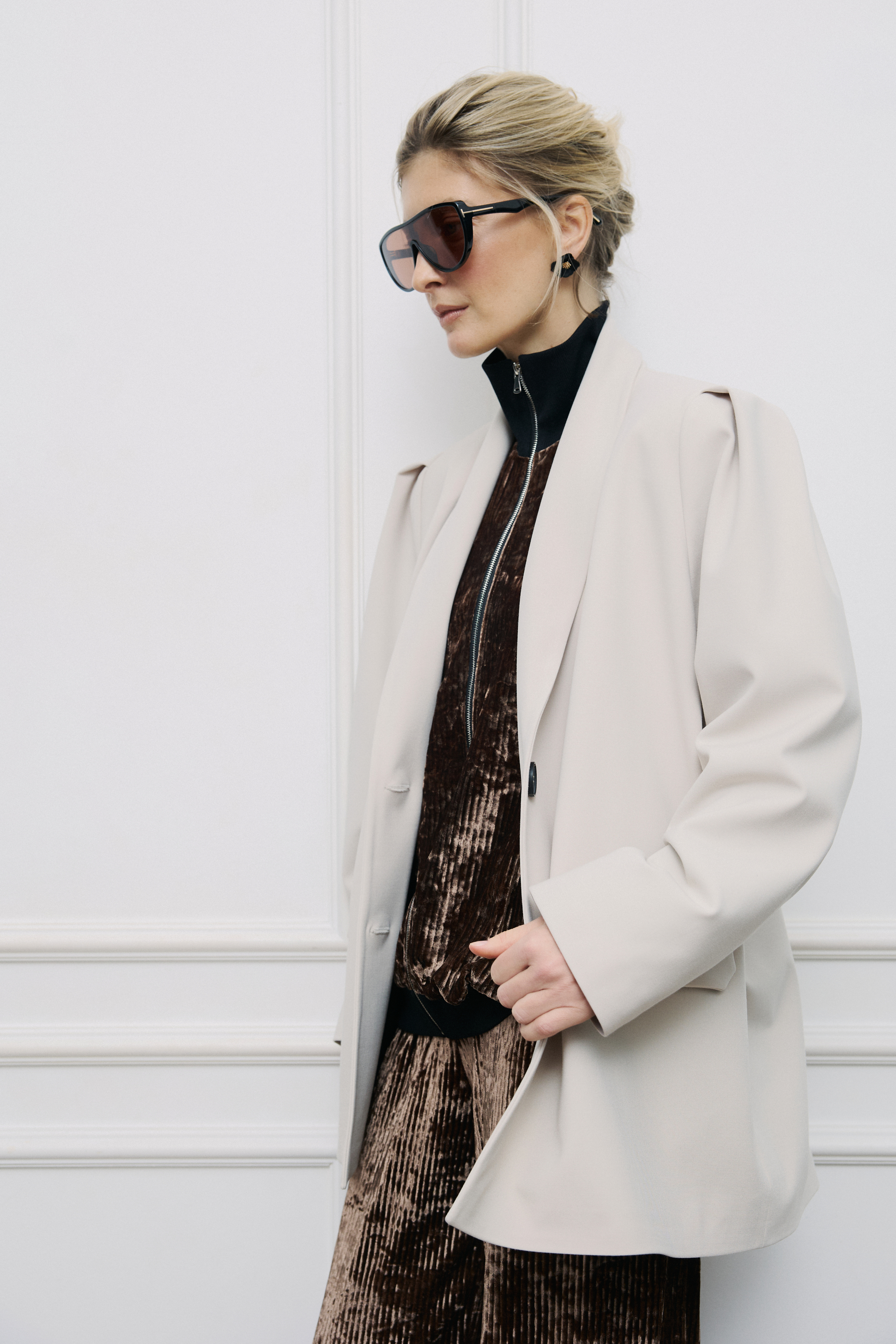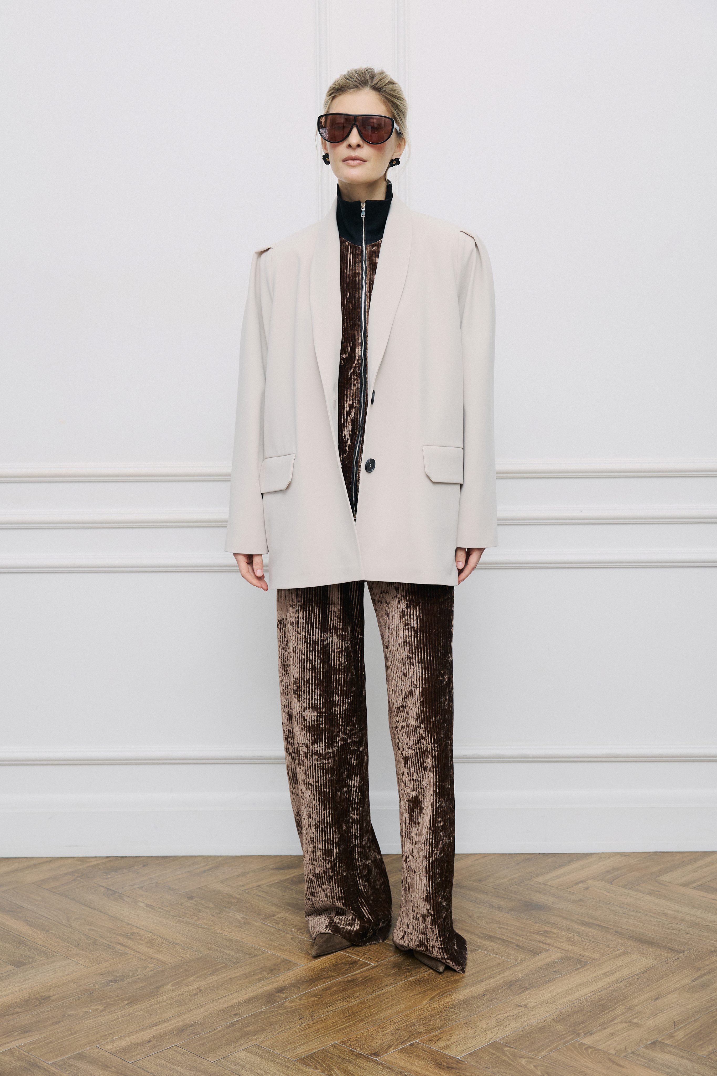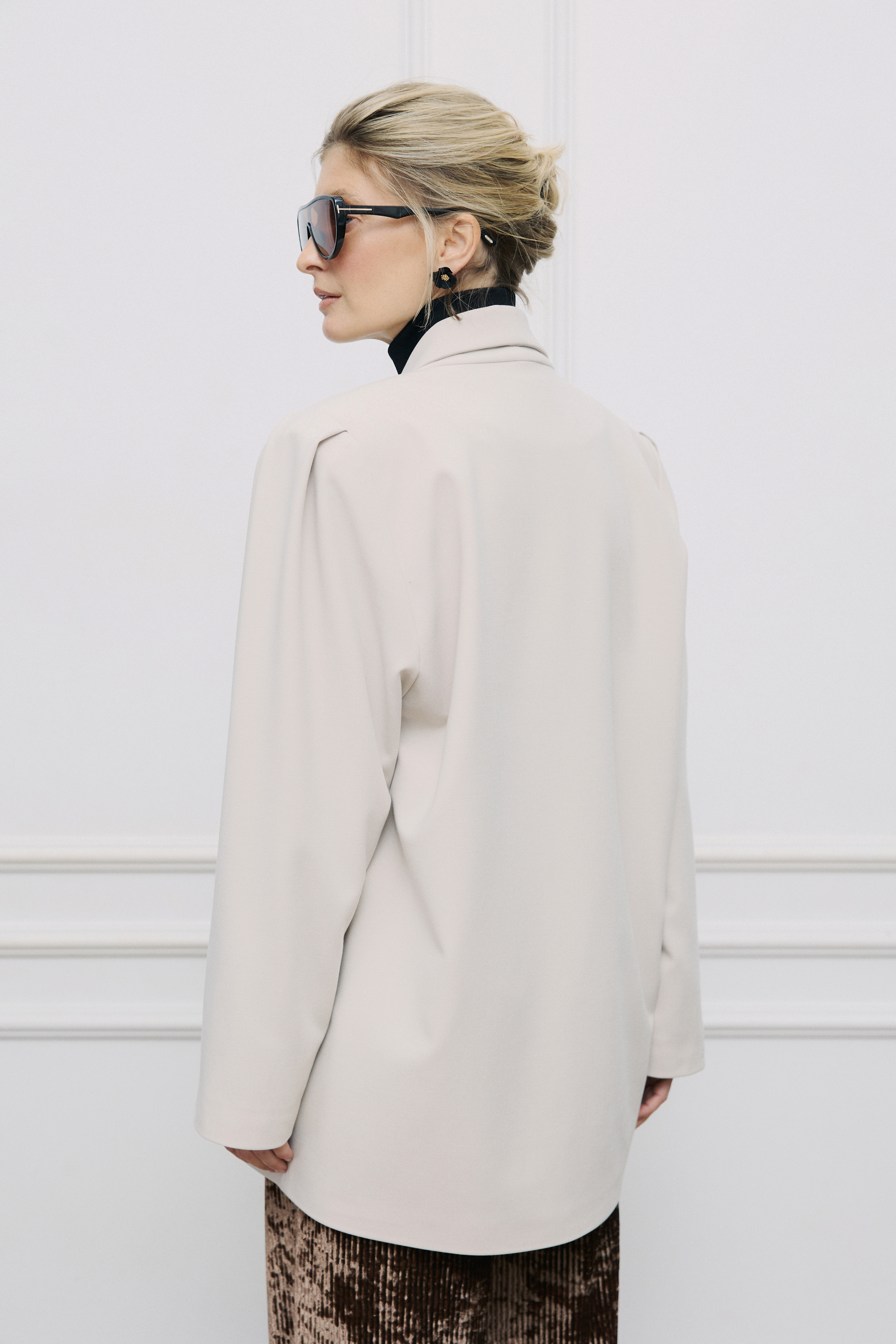 Пиджак оверсайз с цельнокроеным рукавом в ретро-стиле. Модель с изящной бантовой складкой на рукаве, которая добавляет образу женственности и оригинальности.