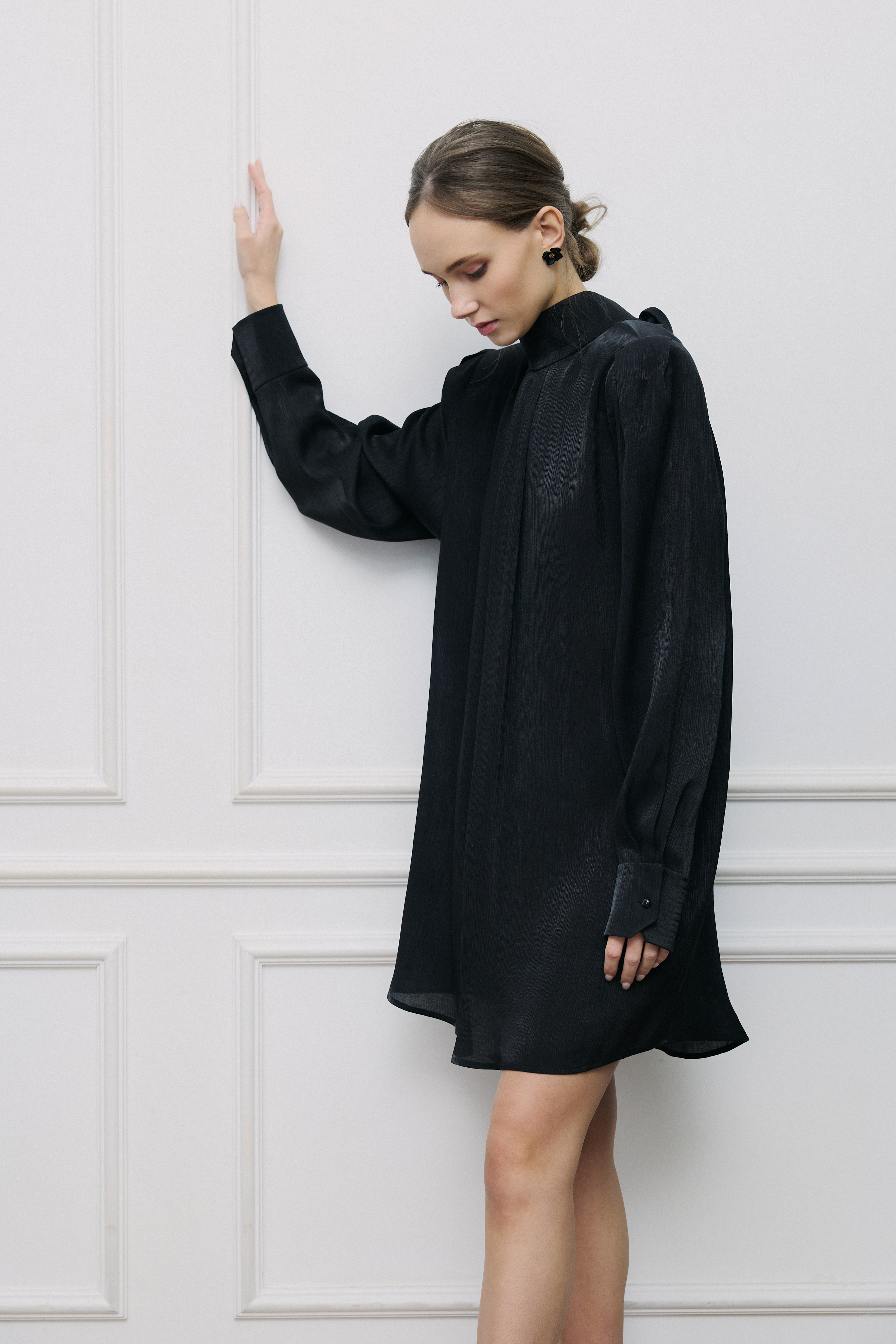 Платье из красного крэш-вискозы. Модель с элегантным воротником-завязкой и умеренно открытой спиной. Универсальный силуэт, который можно носить с поясом или без, создавая два разных образа.