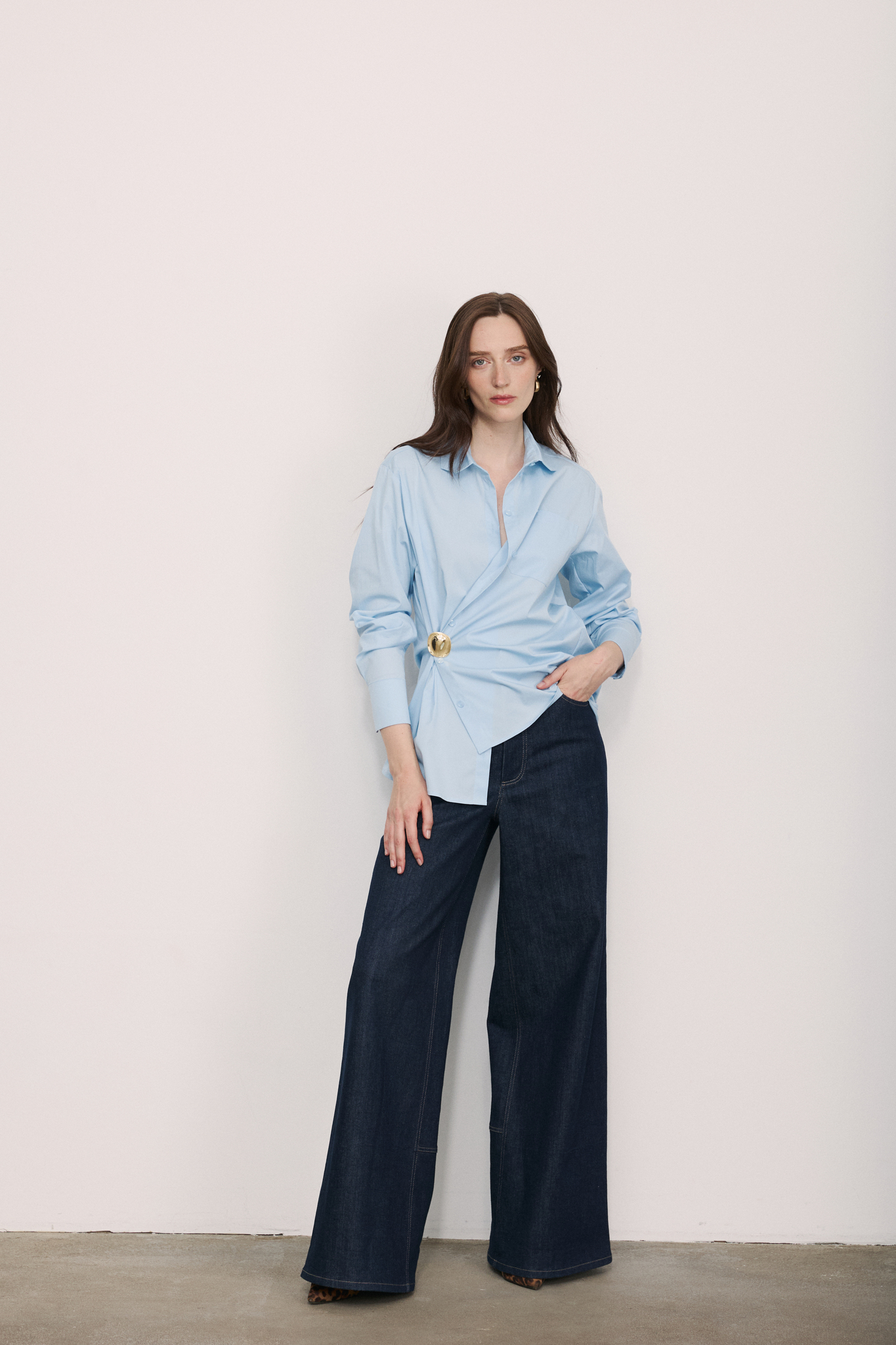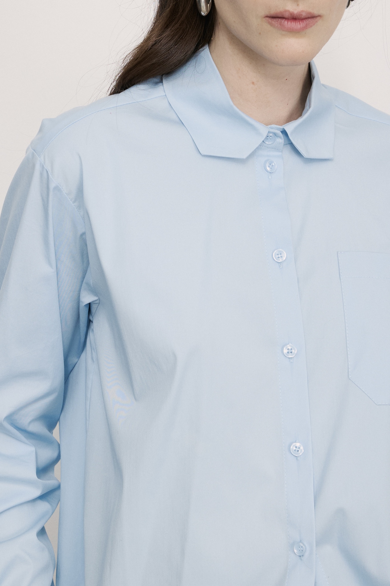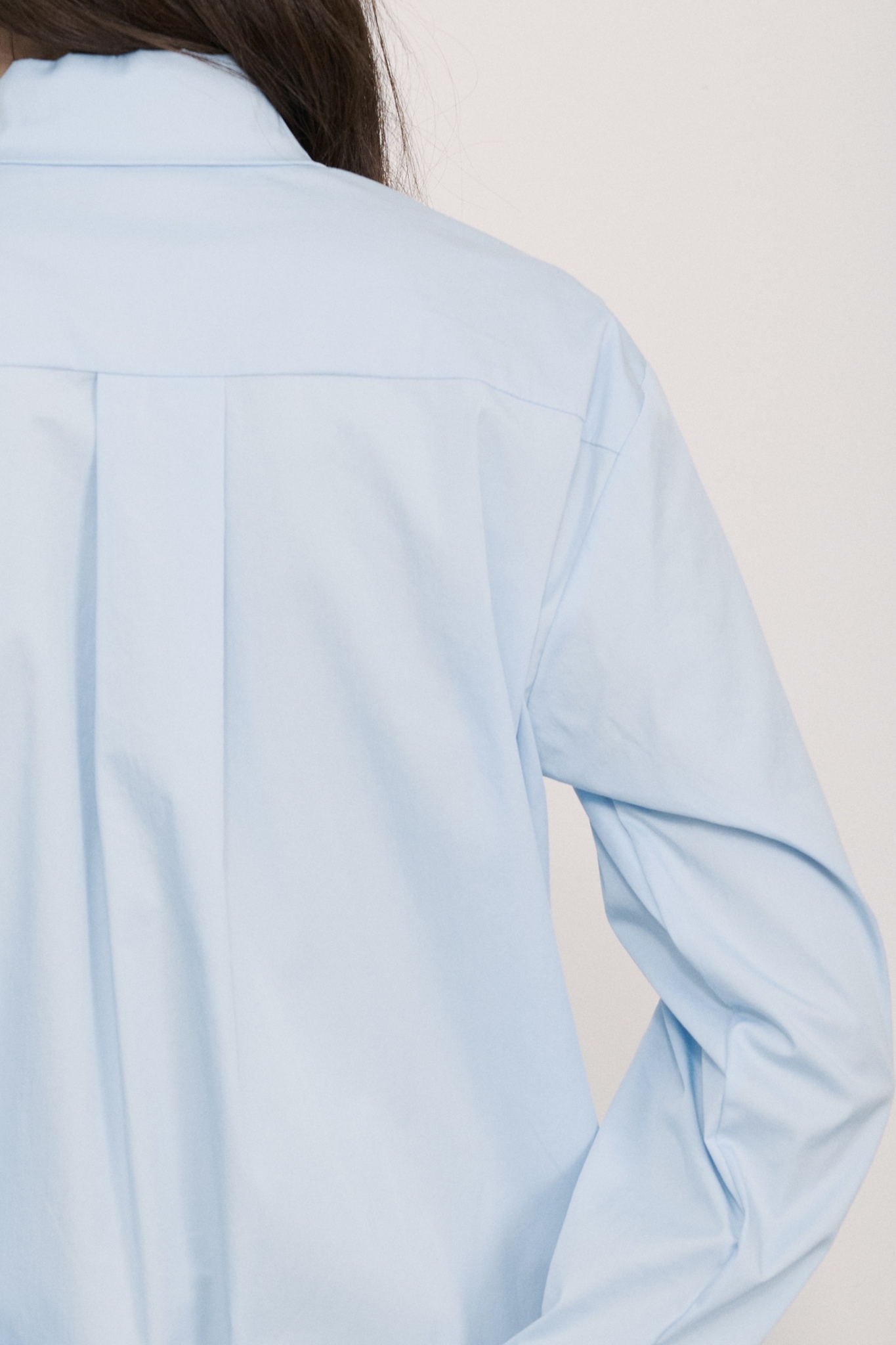 Базовая рубашка голубого цвета свободного кроя с приспущенным плечом и манжетом по низу. На полочке расположен удобный карман, а по спинке — кокетка и бантовая складка, придающие модели изящность и стиль. Низ рубашки выполнен фигурным, с удлинением по спинке, что создает современный силуэт.