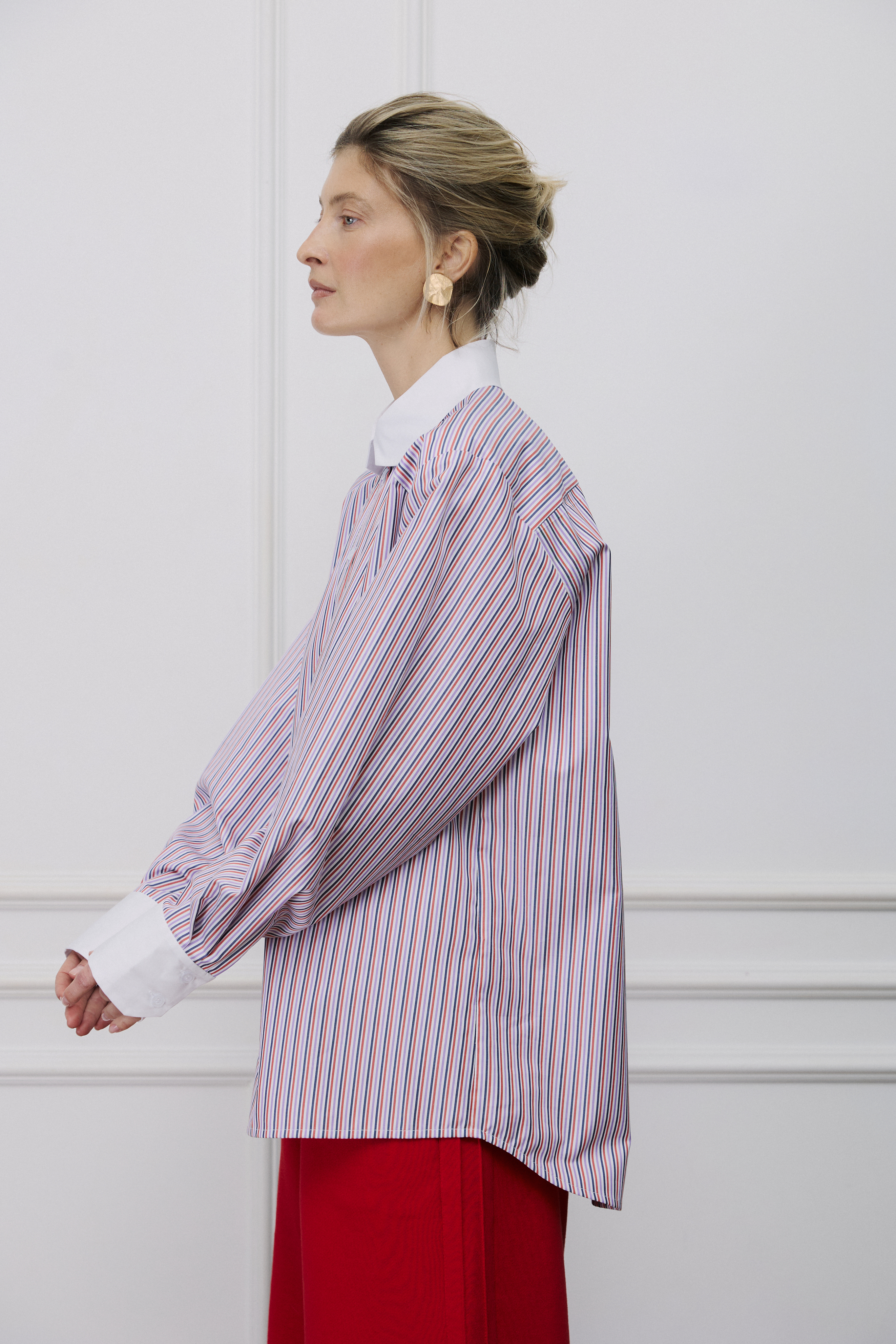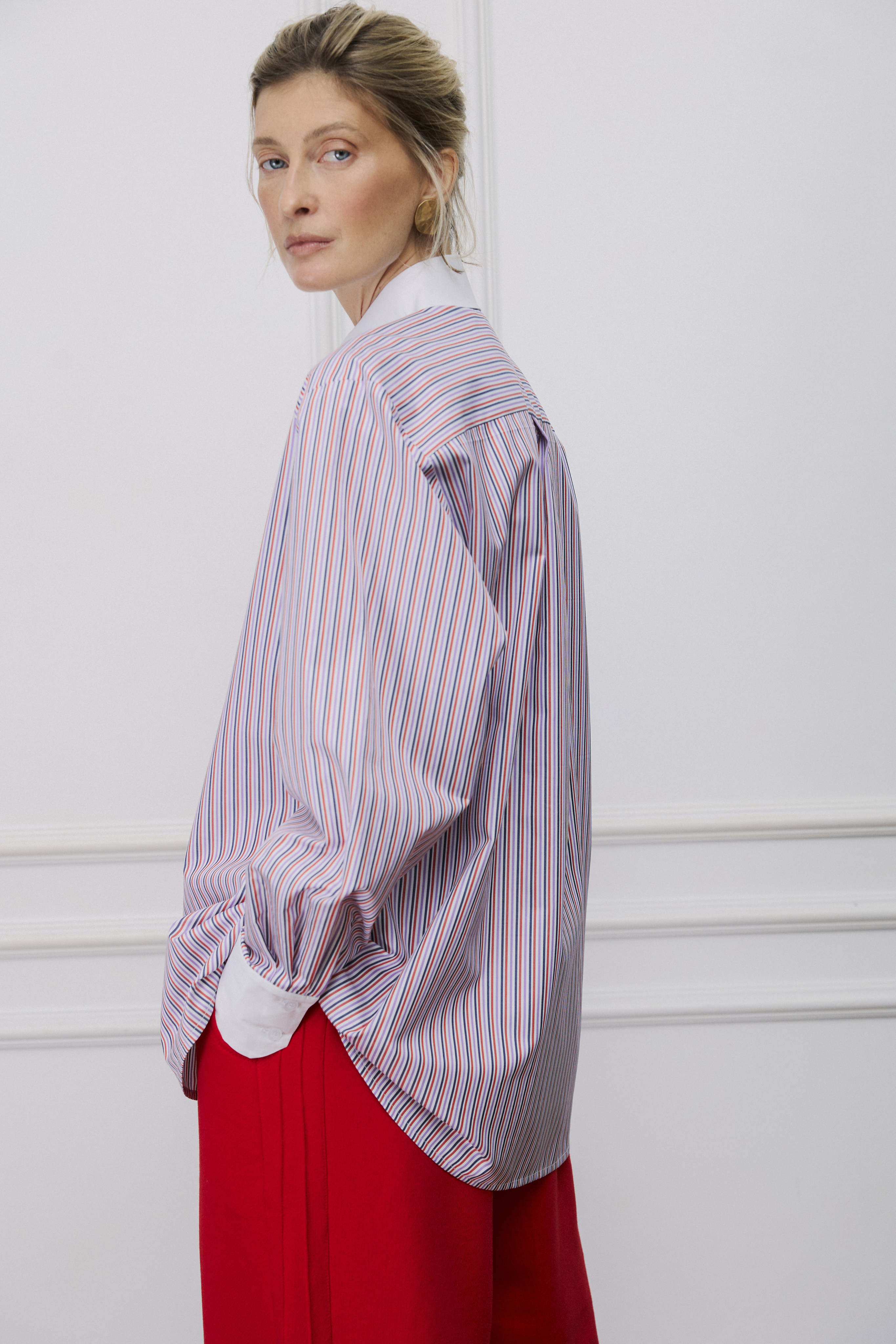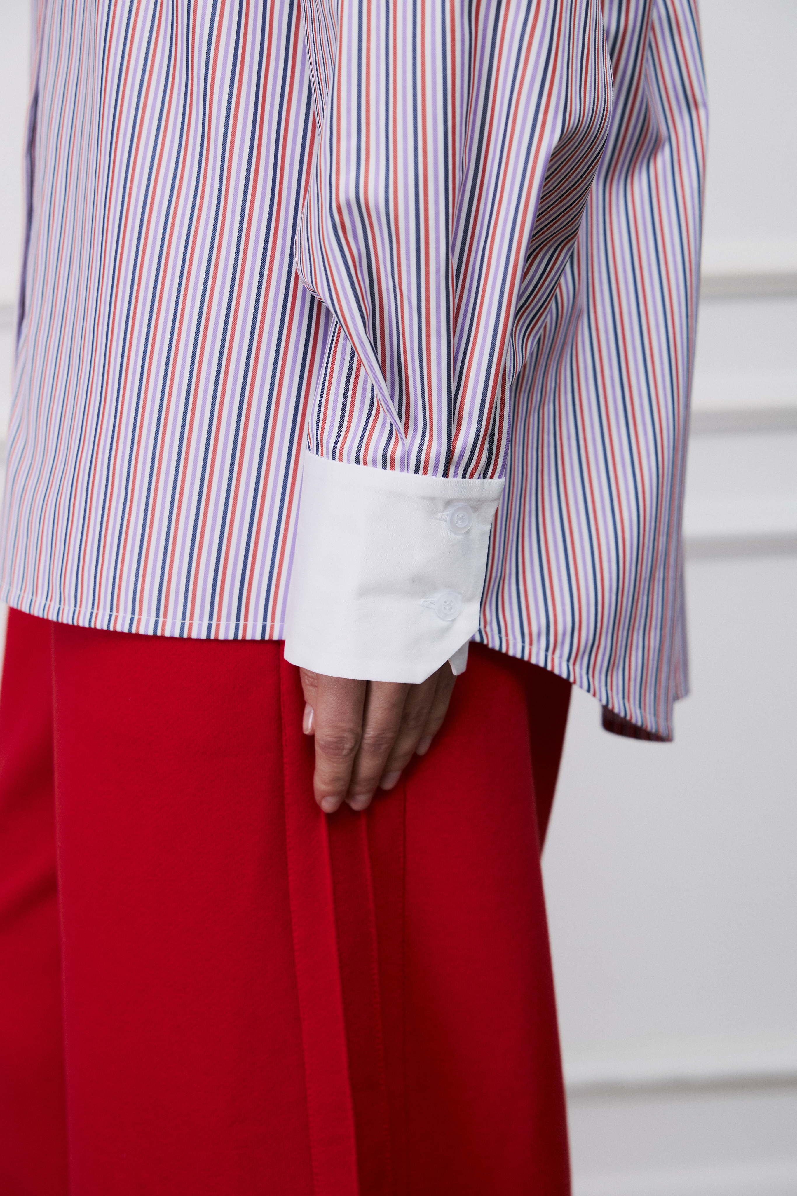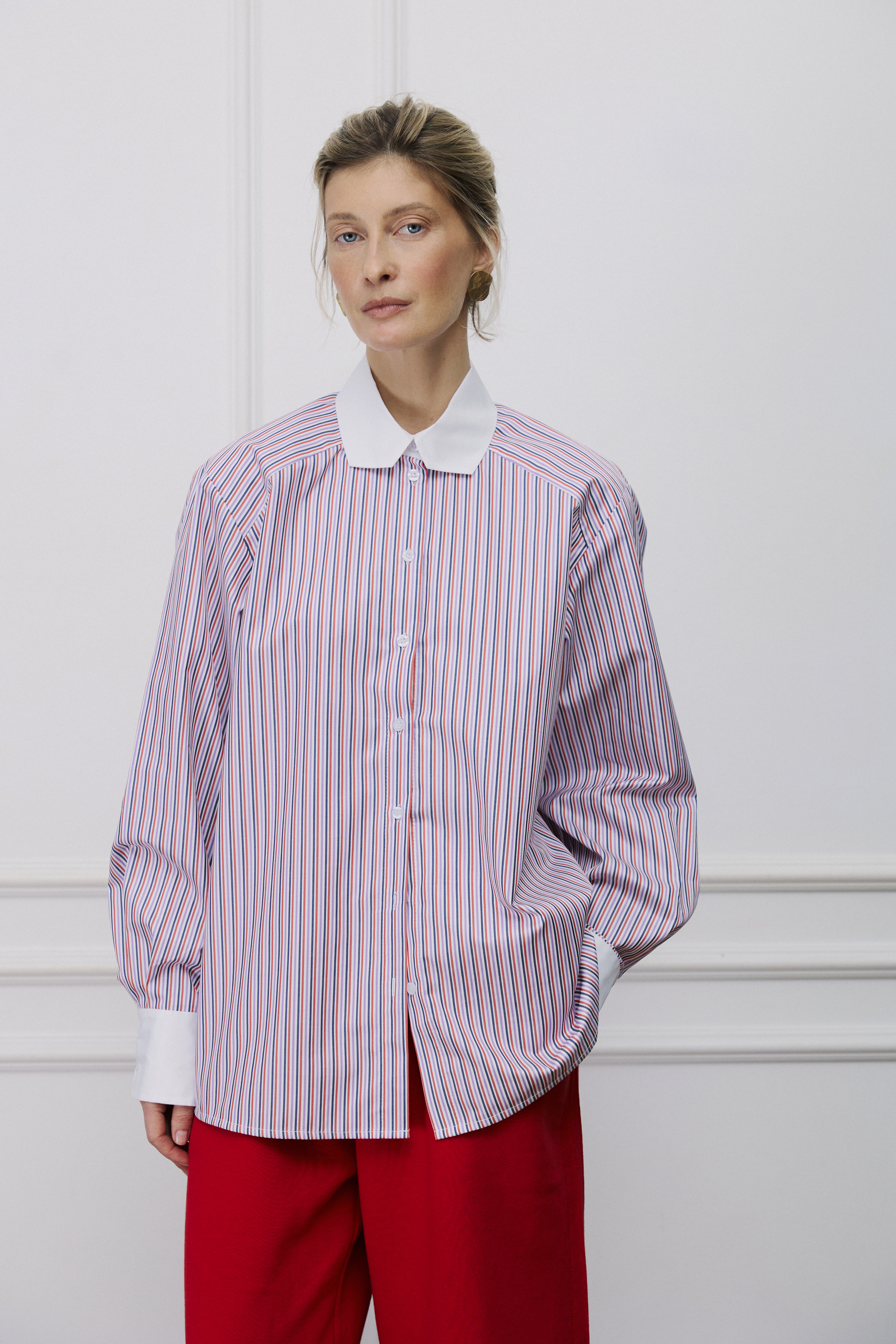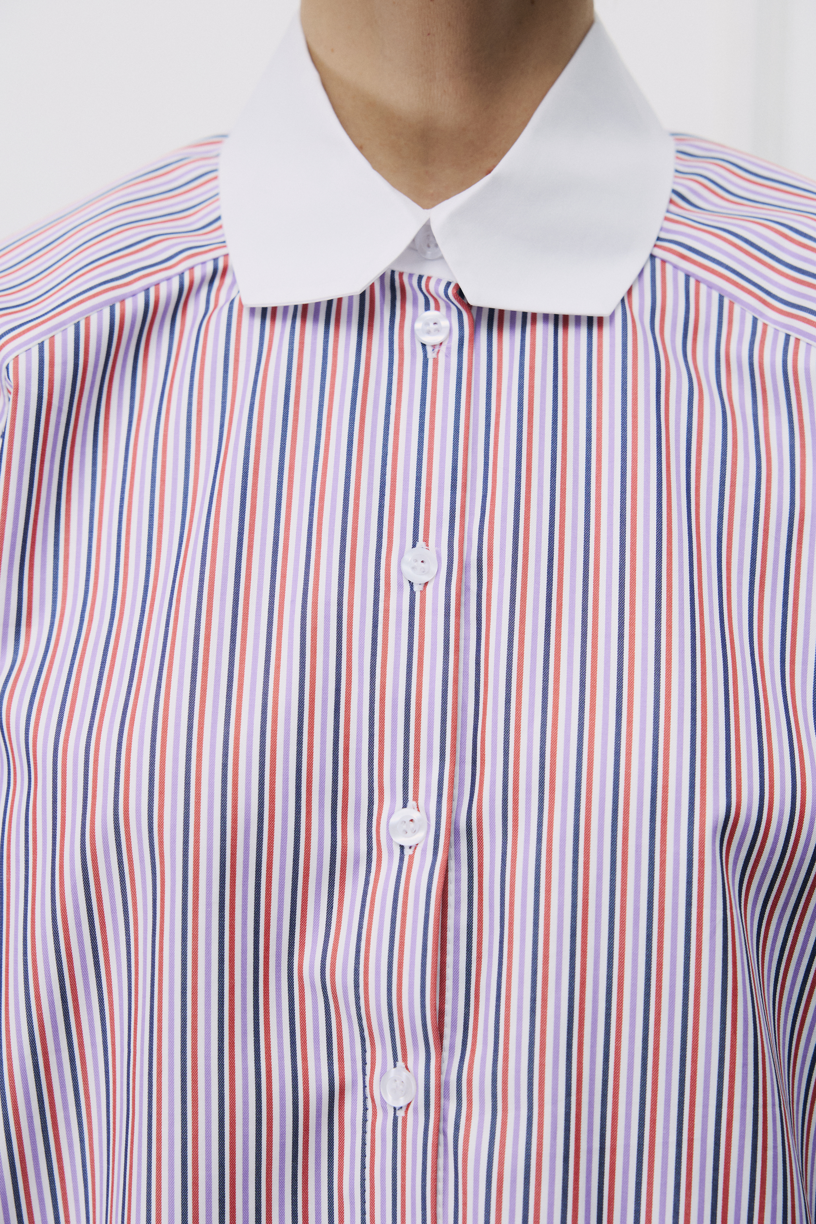 Мы назвали эту рубашку в честь динамичной жизни наших покупательниц. Отшита из премиального хлопка. Белый контрастный воротник и манжеты придают модели особую графичность и свежесть.