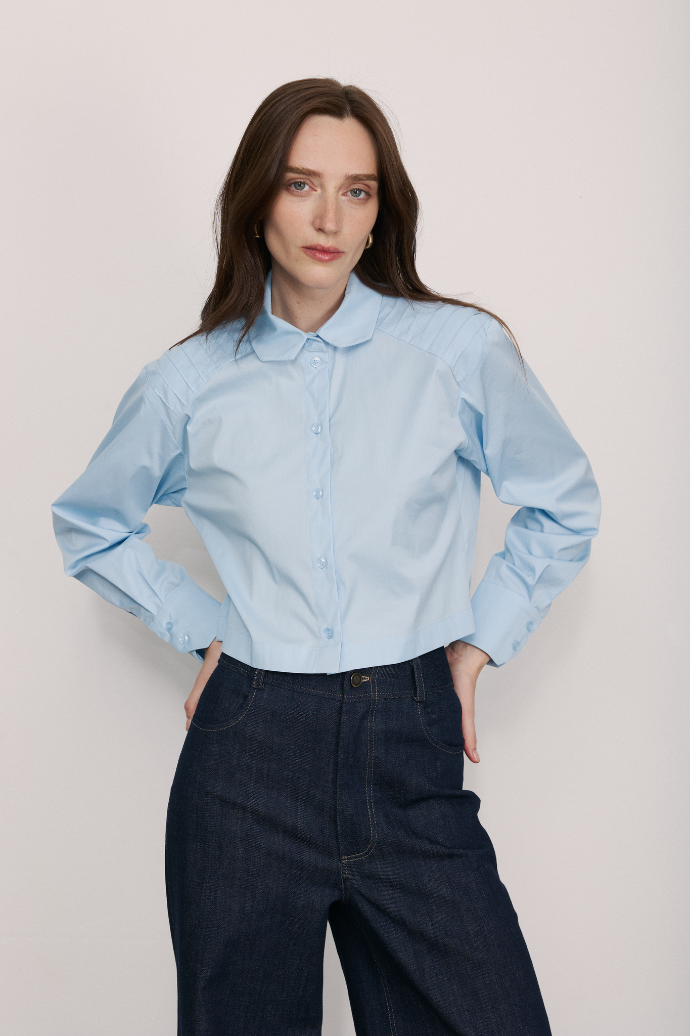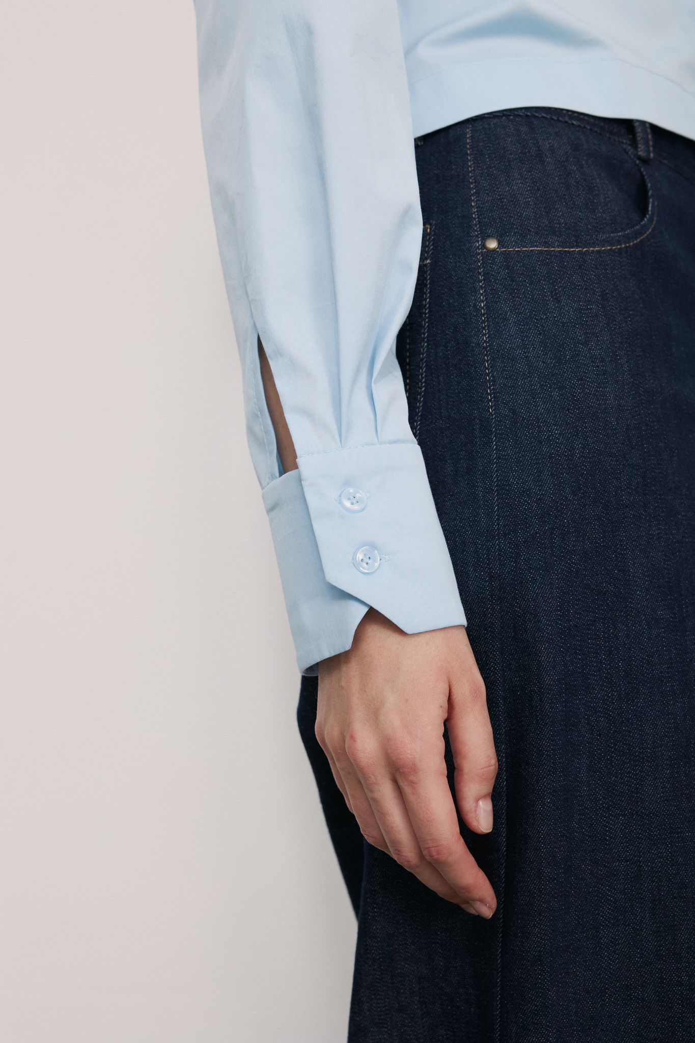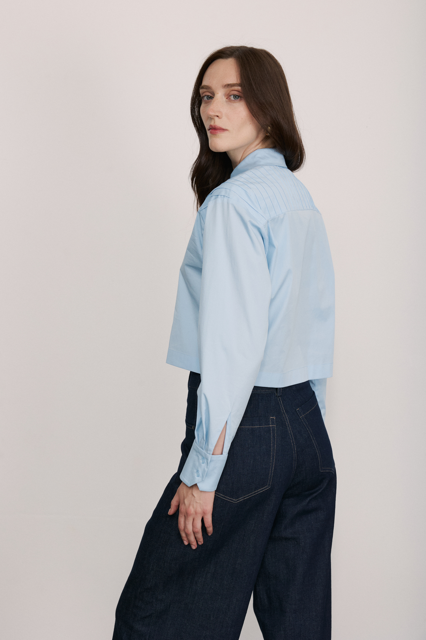 Укороченная рубашка, выполненная из высококачественного итальянского хлопка. Оригинальная контрастная прострочка на кокетке спинки и переда, которая подчеркивает современный крой и добавляет образу выразительности.Актуальный укороченный силуэт делает эту модель идеальной для ношения с брюками классического/завышенного кроя или юбками.